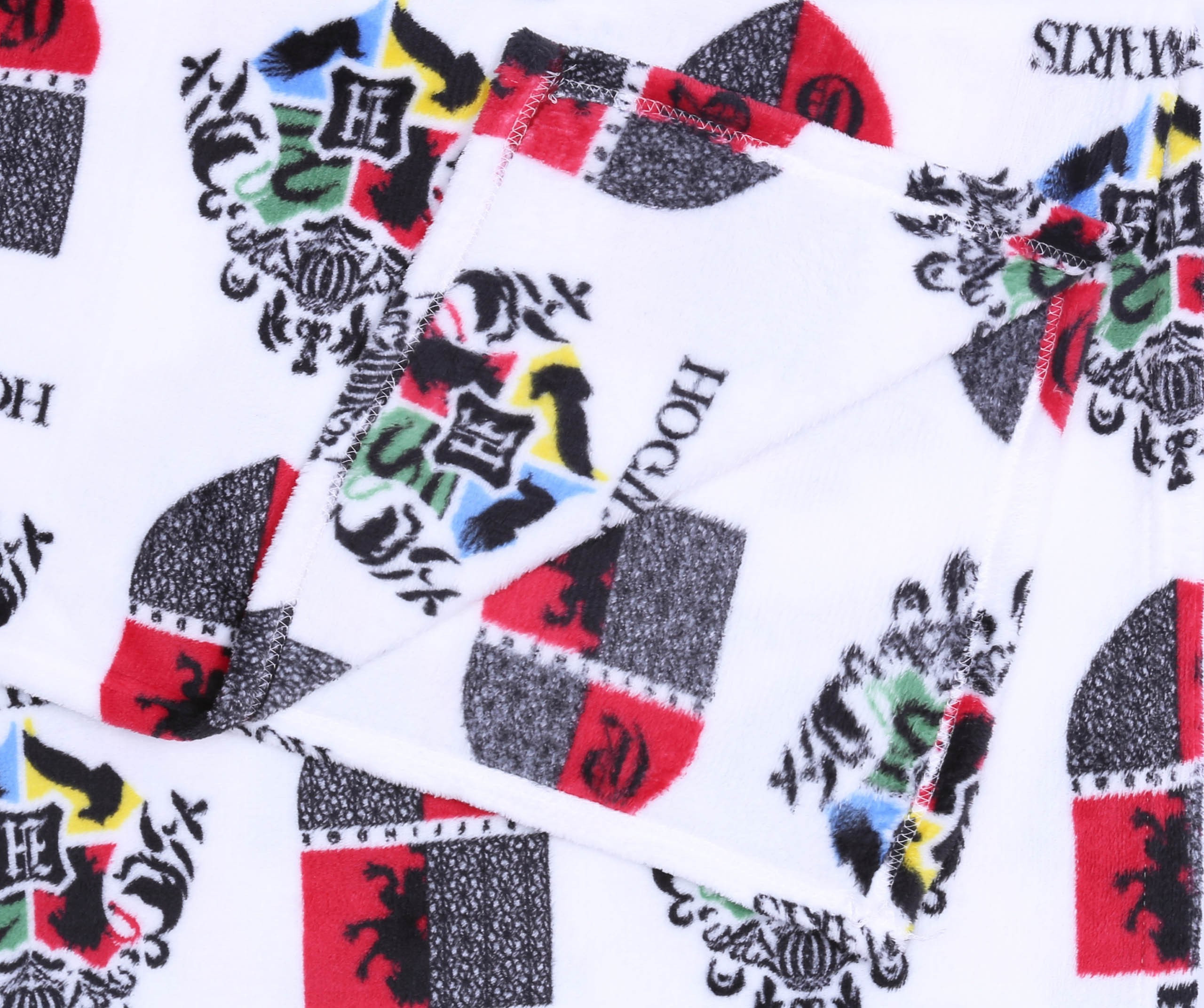Duży, biały koc/narzuta w powtarzający się wzór herbu Hogwartu oraz jednego z domów - Gryffindor.