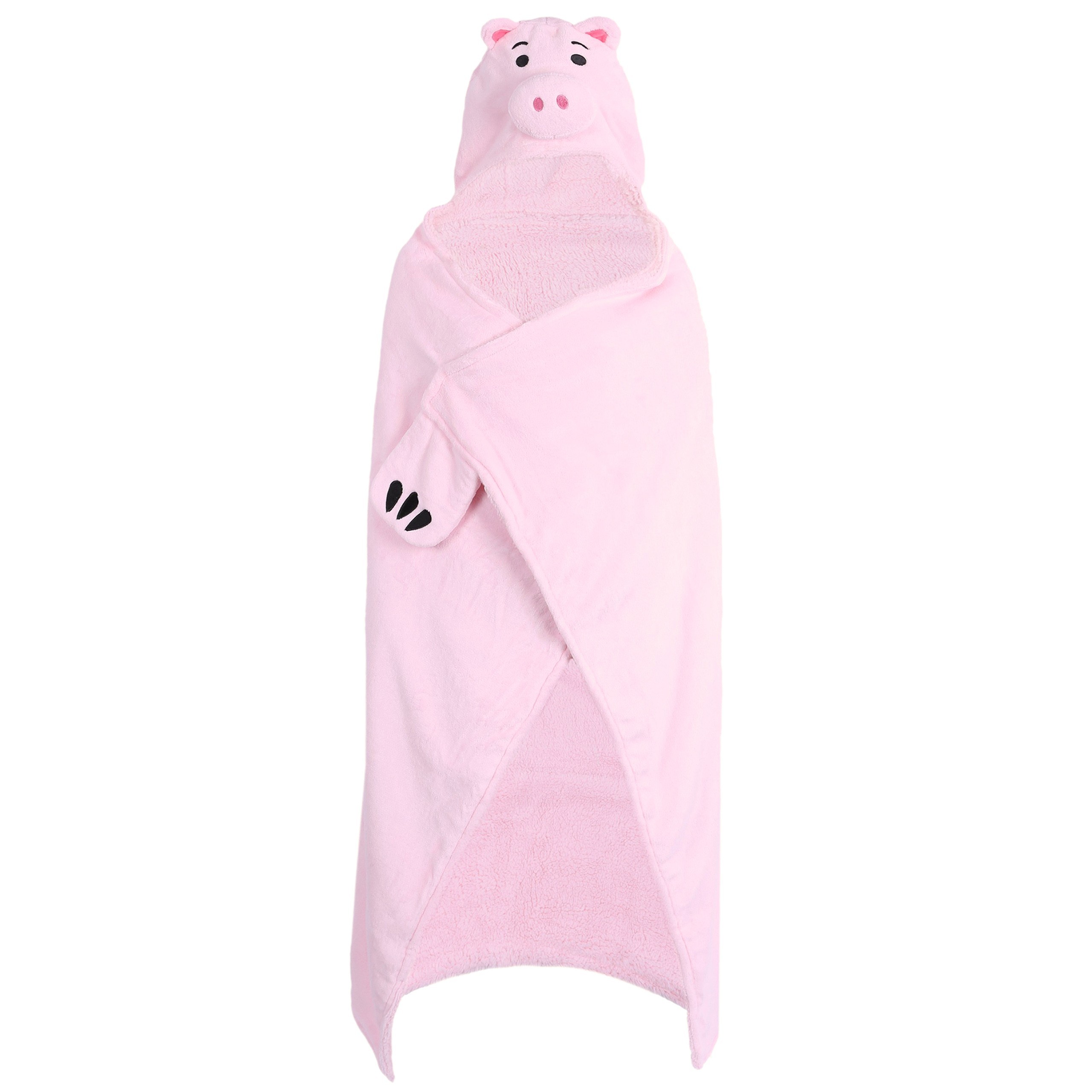 Duża, różowa narzutka z kapturem przedstawiającym postać świnki Hamm, postaci z filmów animowanych "Toy Story".