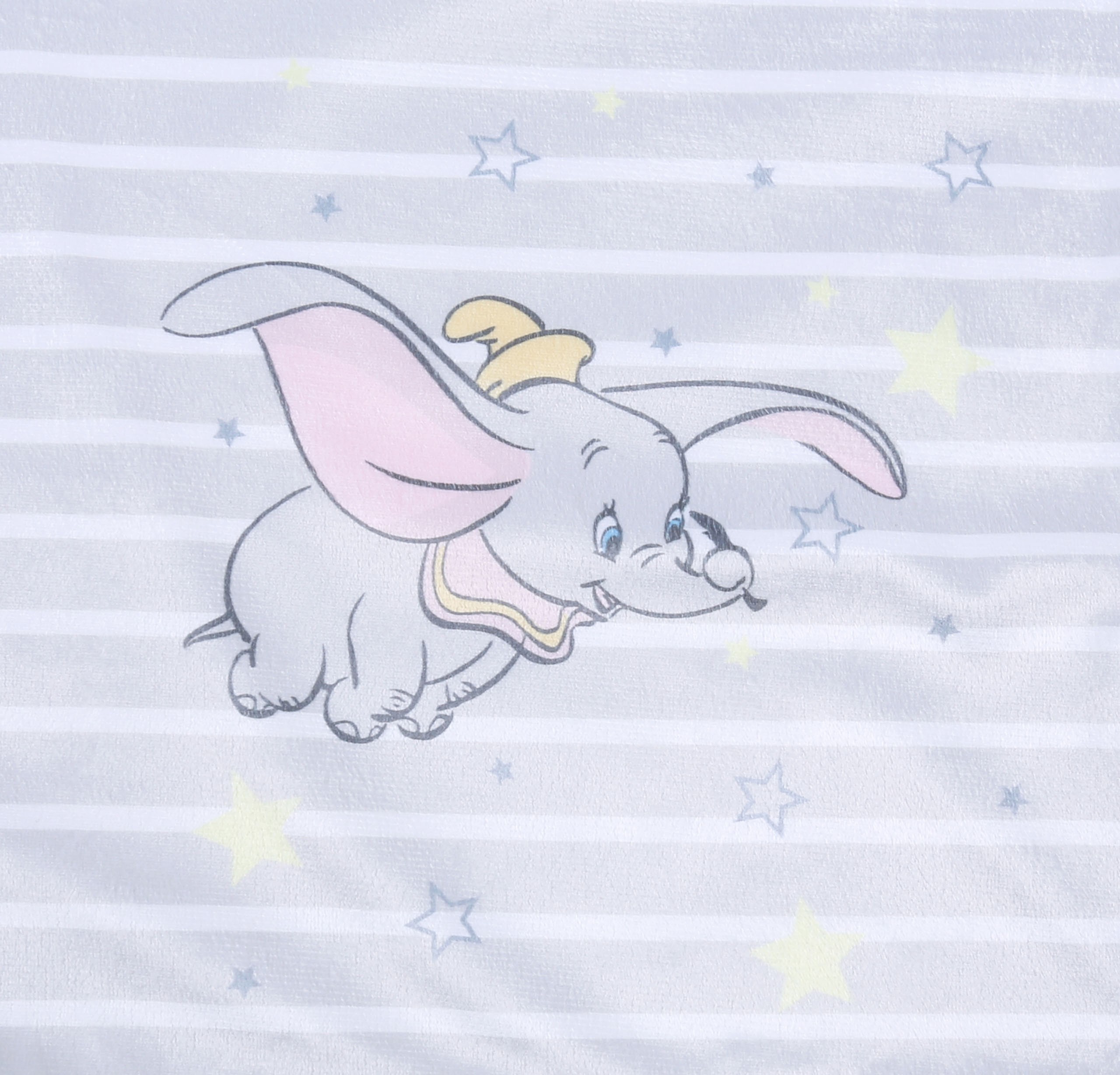 Delikatny, niemowlęcy koc, biały z jednej strony, z drugiej beżowy w białe paseczki z motywem słonika Dumbo.