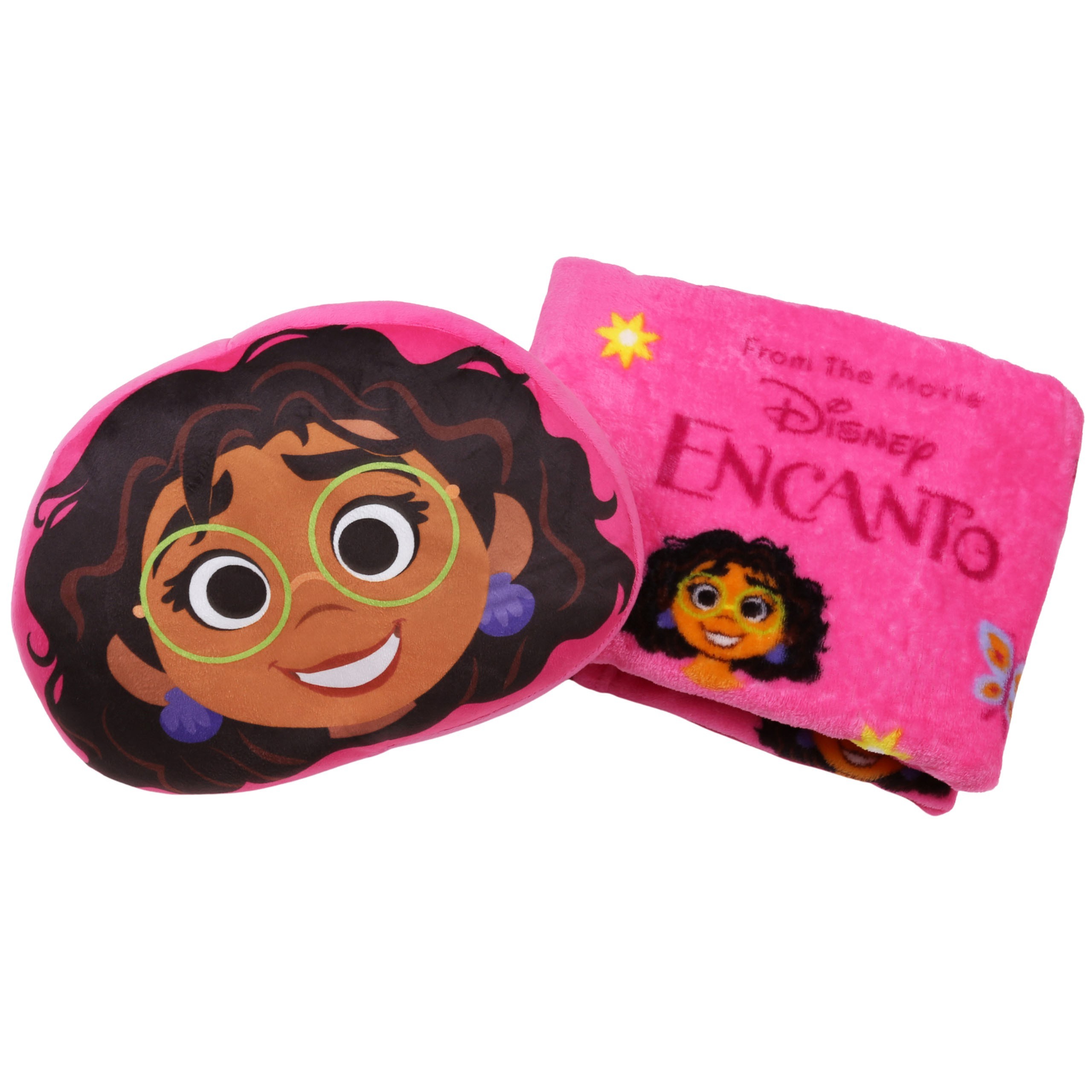 Różowy komplet składający się z poduszki oraz koca, z motywem motylków i wizerunkiem tytułowej bohaterki filmu familijnego "Nasze magiczne Encanto".