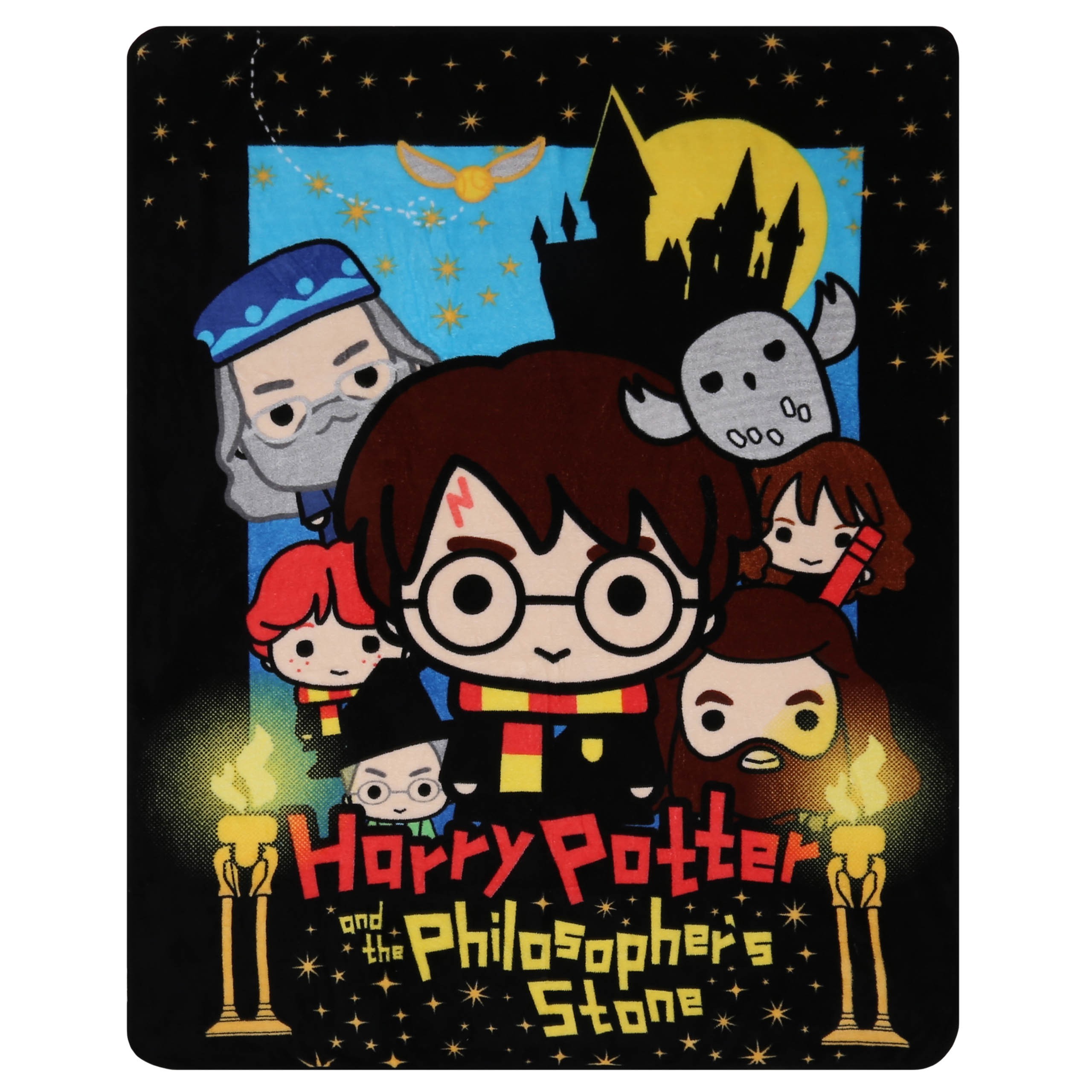 Czarny koc/narzuta z kolorowymi nadrukami wizerunków postaci z serii filmów "Harry Potter".