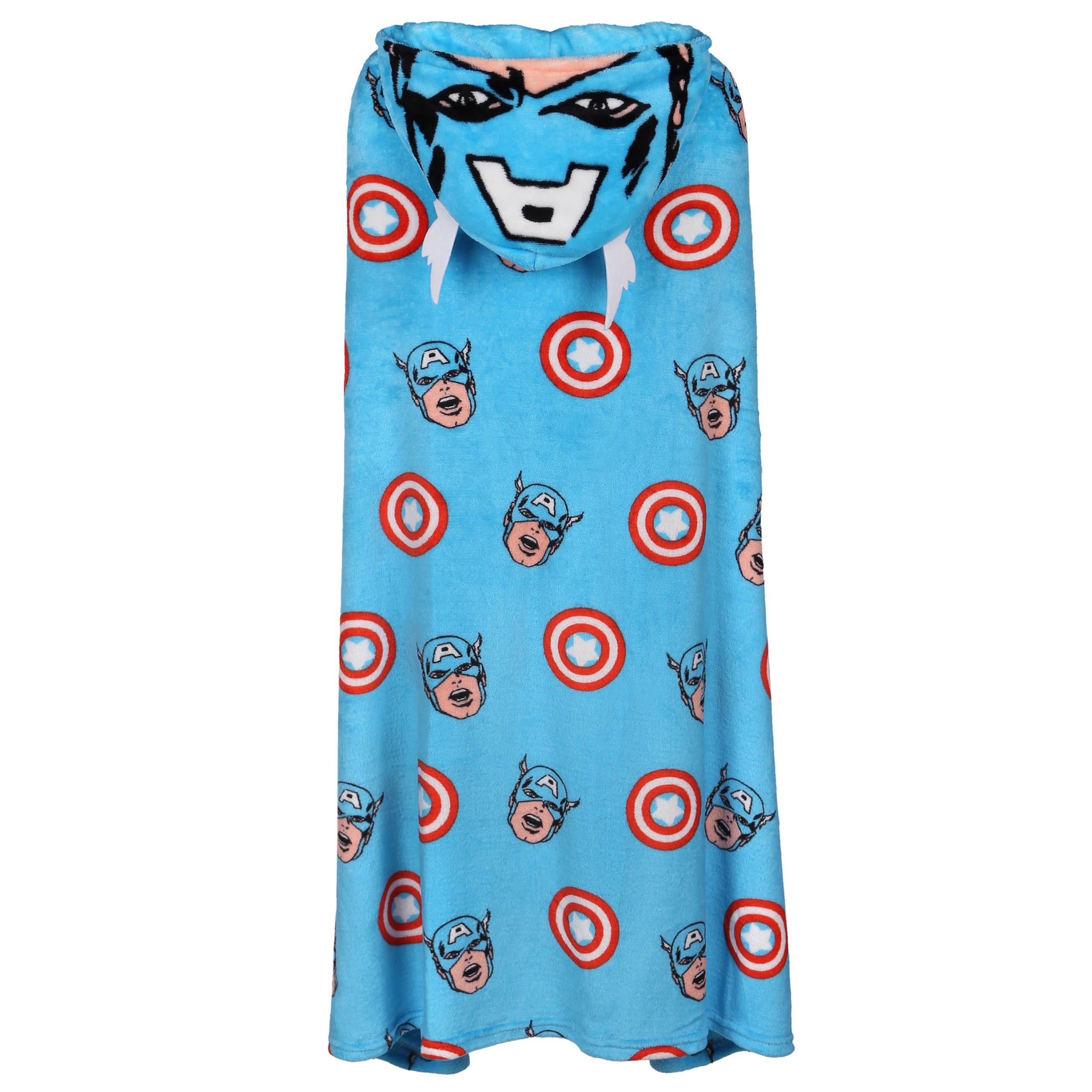 Duża, niebieska narzutka z kapturem, w powtarzający się wzór symbolu superbohatera - Kapitana Ameryki.