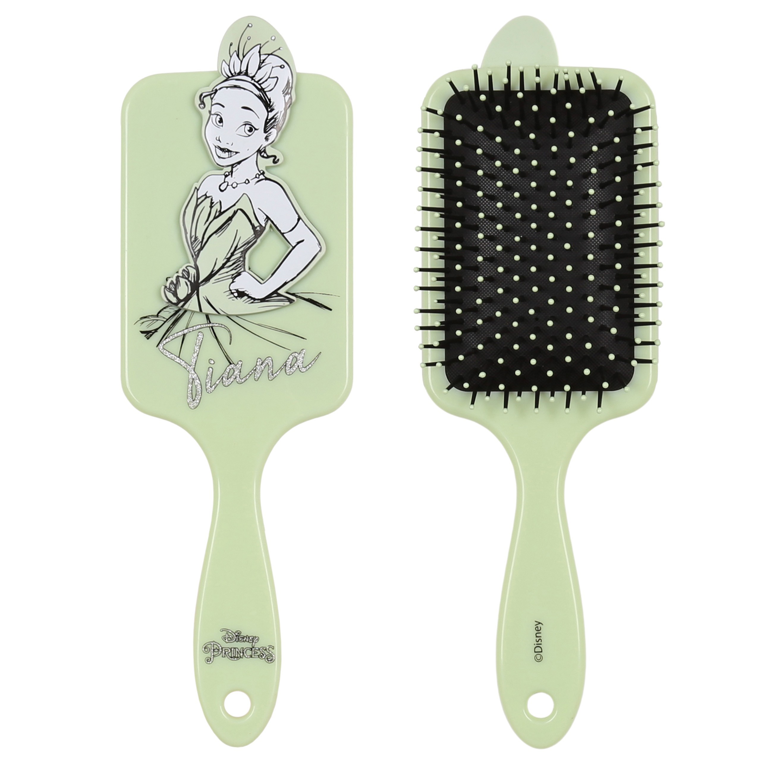 Szczotka do włosów w seledynowym kolorze, z tyłu z gumową aplikacją przedstawiającą jedną z księżniczek Disney'a - Tianę.