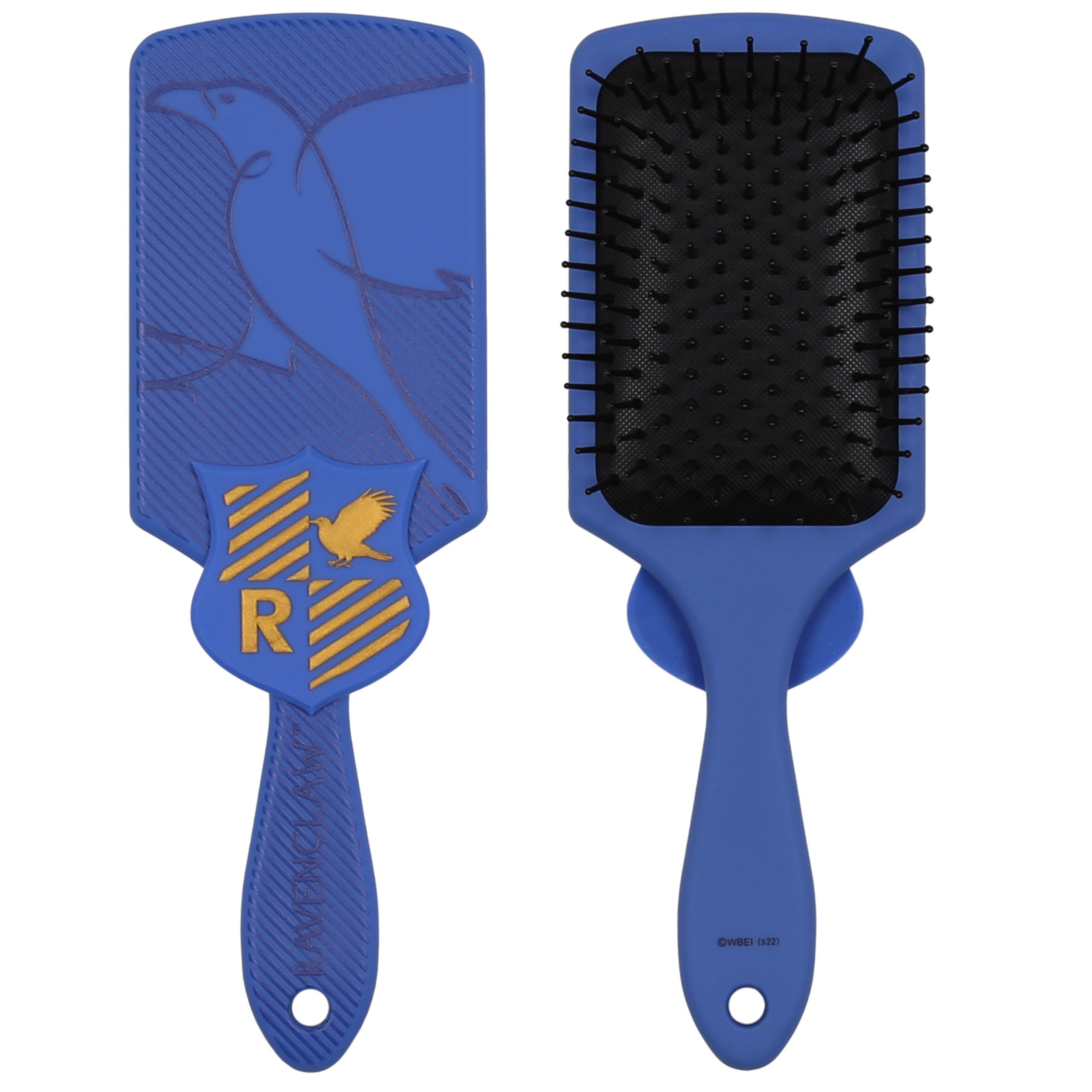Niebieska szczotka do włosów, z tyłu z gumową aplikacją przedstawiającą herb jednego z Domów Hogwartu-Ravenclaw.