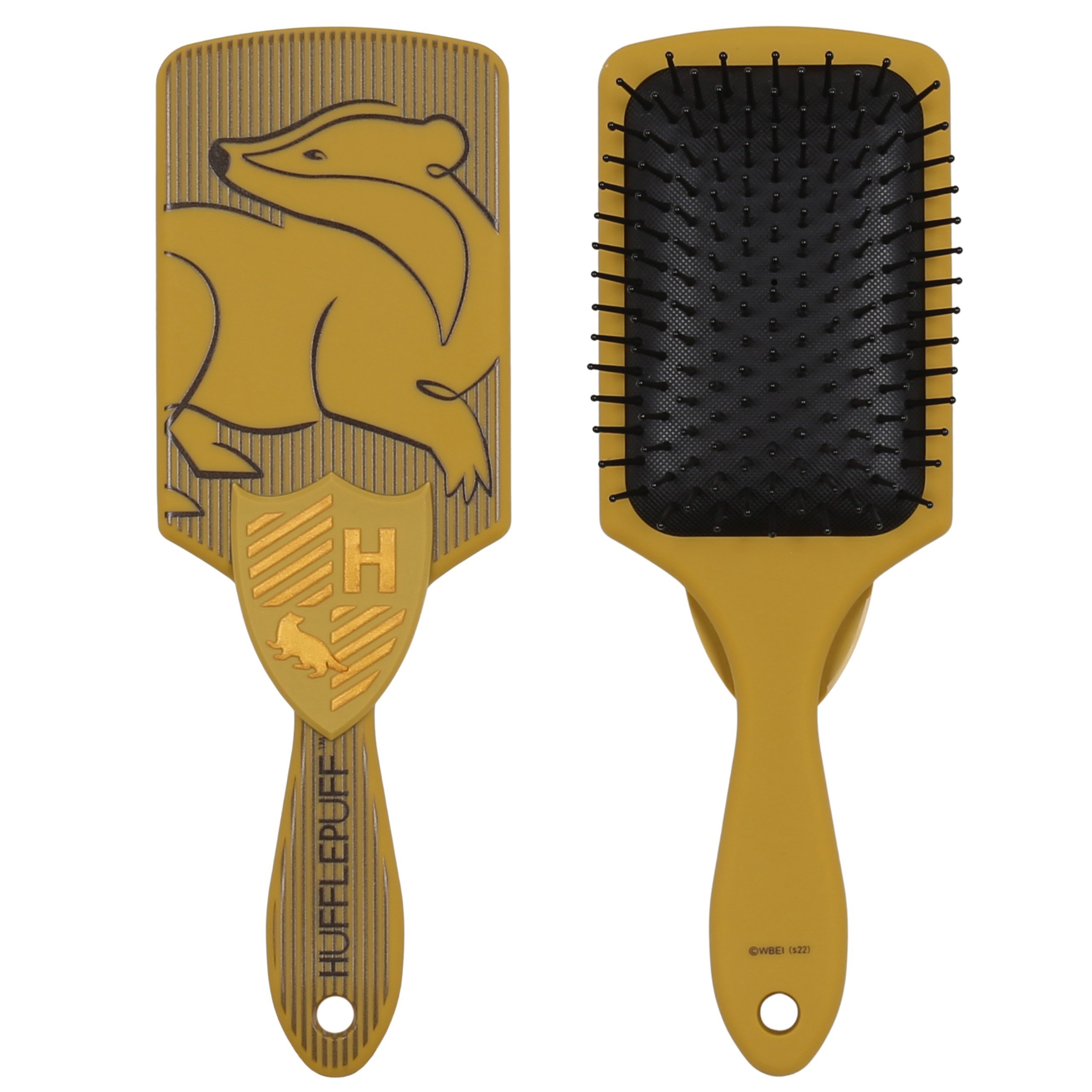 Musztardowa szczotka do włosów, z tyłu z gumową aplikacją przedstawiającą herb jednego z Domów Hogwartu-Hufflepuff.