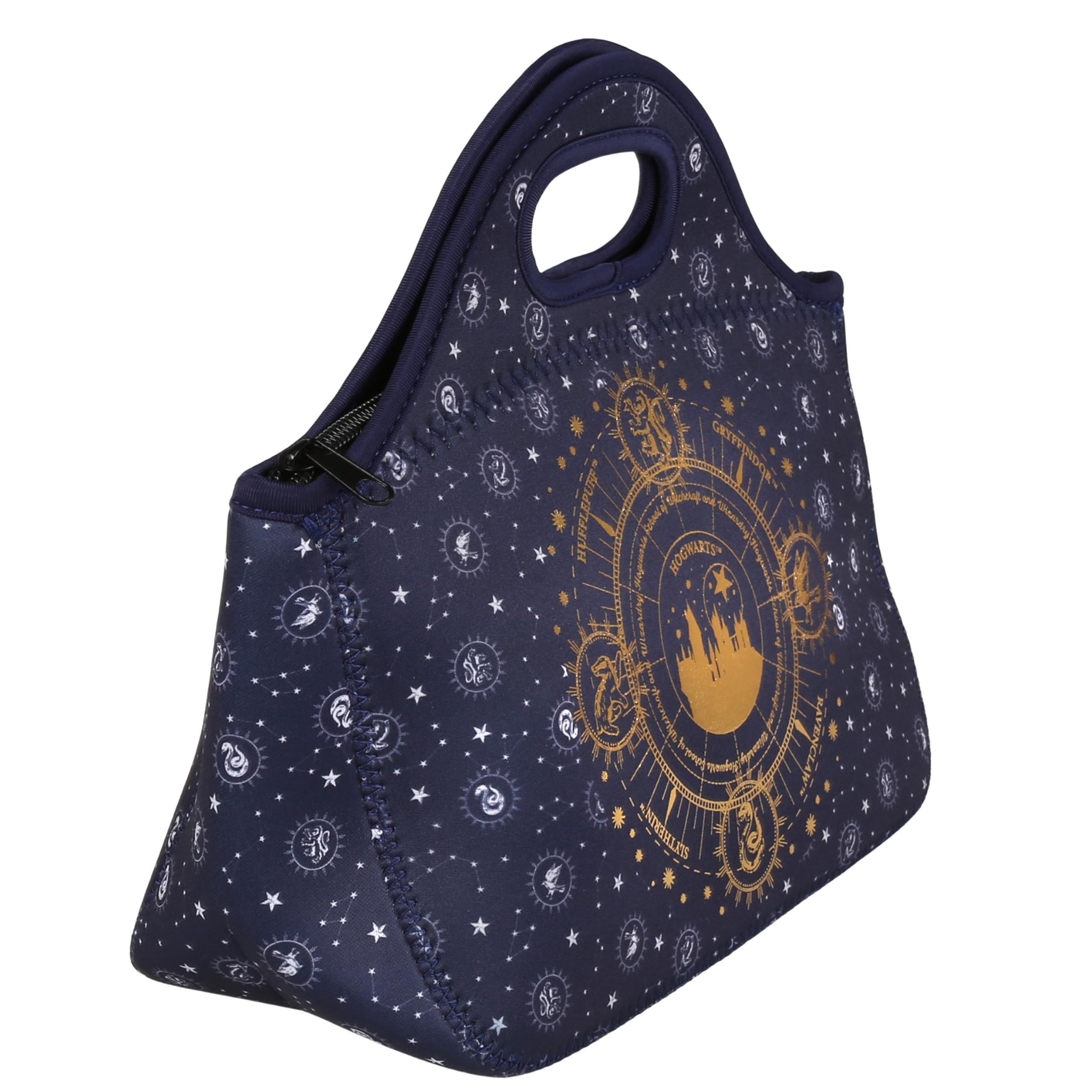 Granatowa torba śniadaniowa w powtarzające się symbole Domów Szkoły Czarodziejstwa i Magii w Hogwarcie.