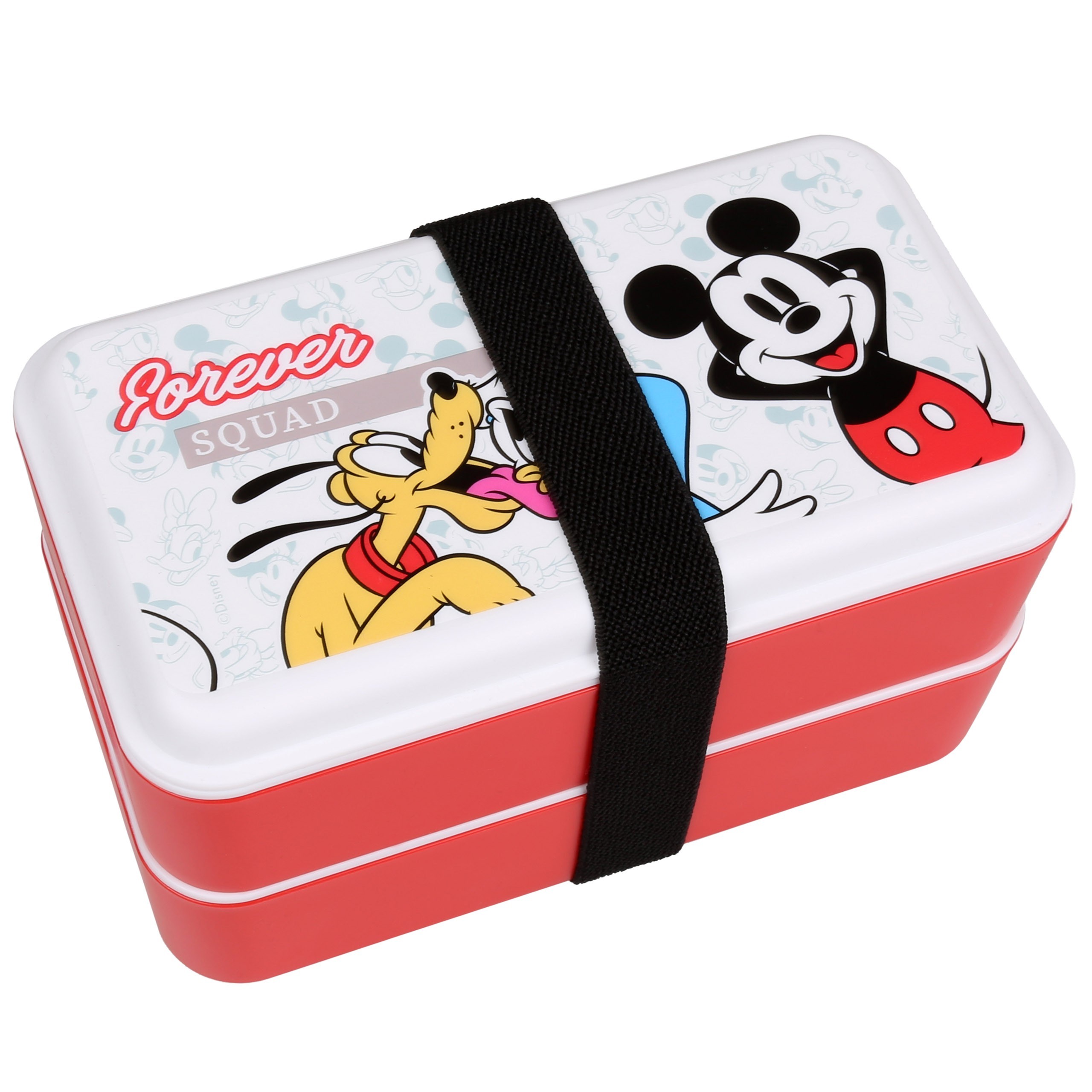 Komplet dwóch pojemników na jedzenie/śniadaniówek w kolorach czerwonym i białym z nadrukiem wizerunków Myszki Mickey, Pluto i Donalda.