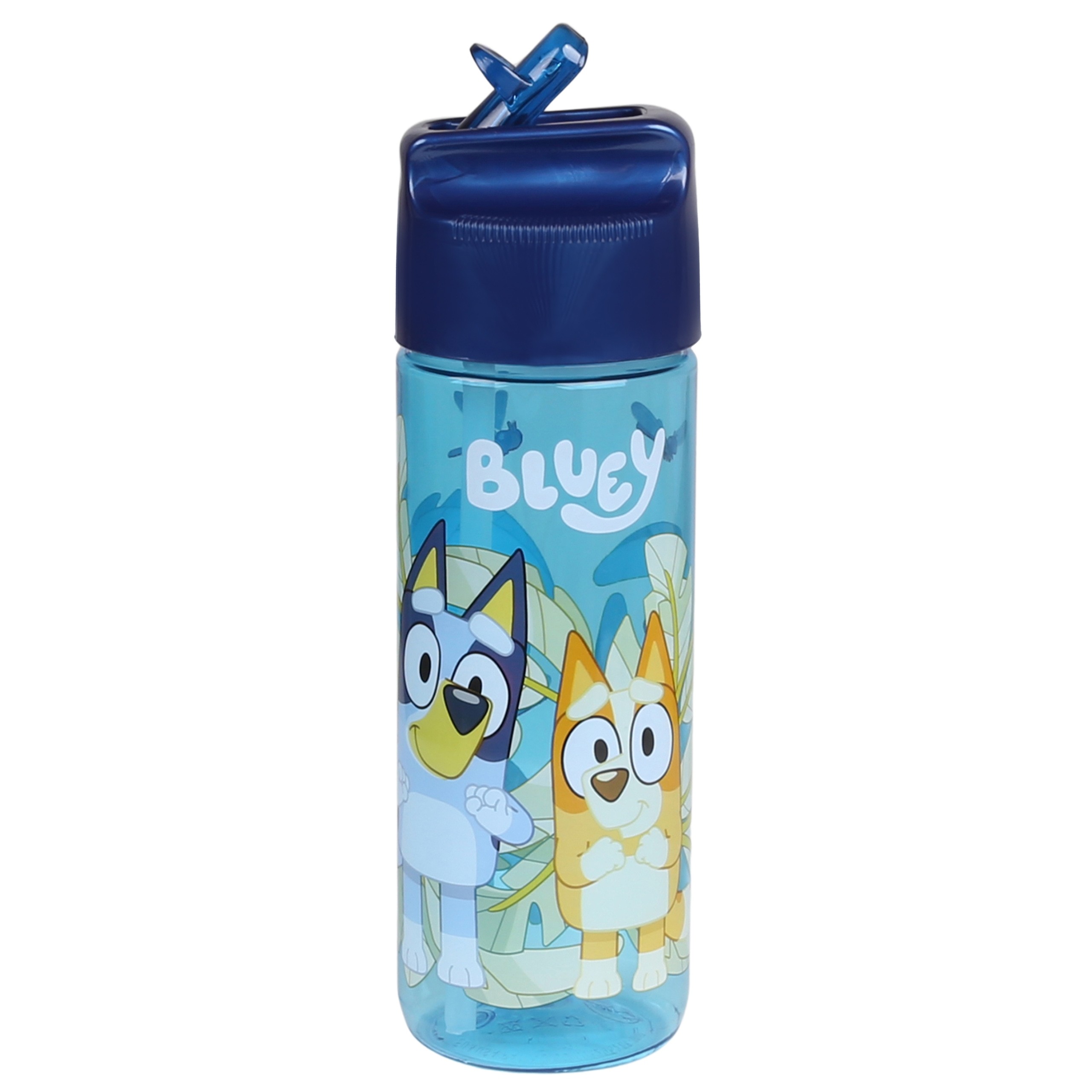 Butelka wykonana jest z trwałego tworzywa sztucznego wolnego od BPA, gwarantując bezpieczeństwo i zdrowie. Kolorowy nadruk z motywem Bluey i liści tropikalnych zachwyci każdego małego fana tej popularnej bajki.