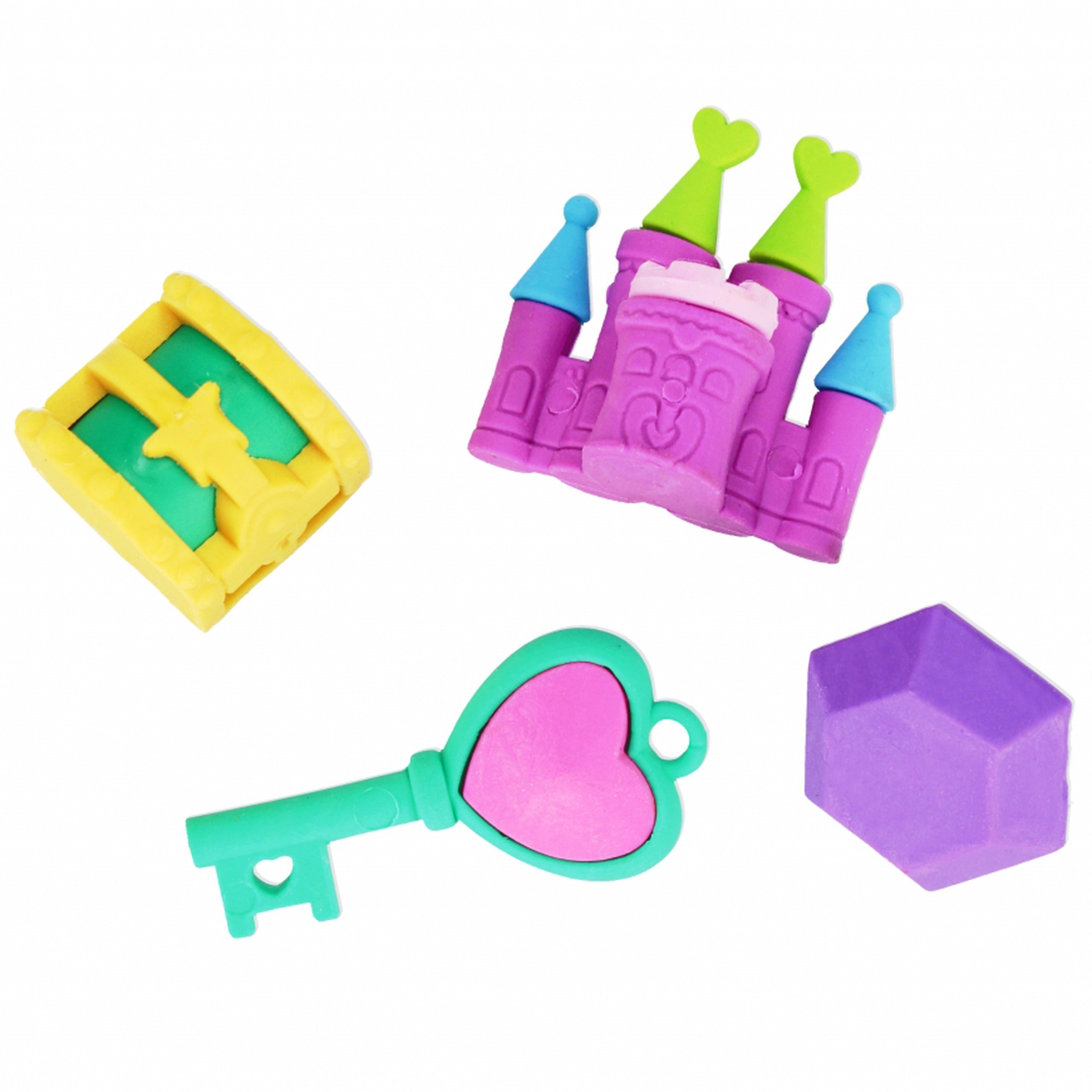 W komplecie znajdują się gumki w kształcie zamku, klucza, skrzyni skarbów oraz kryształu, które zachwycają swoimi żywymi kolorami i detalami.