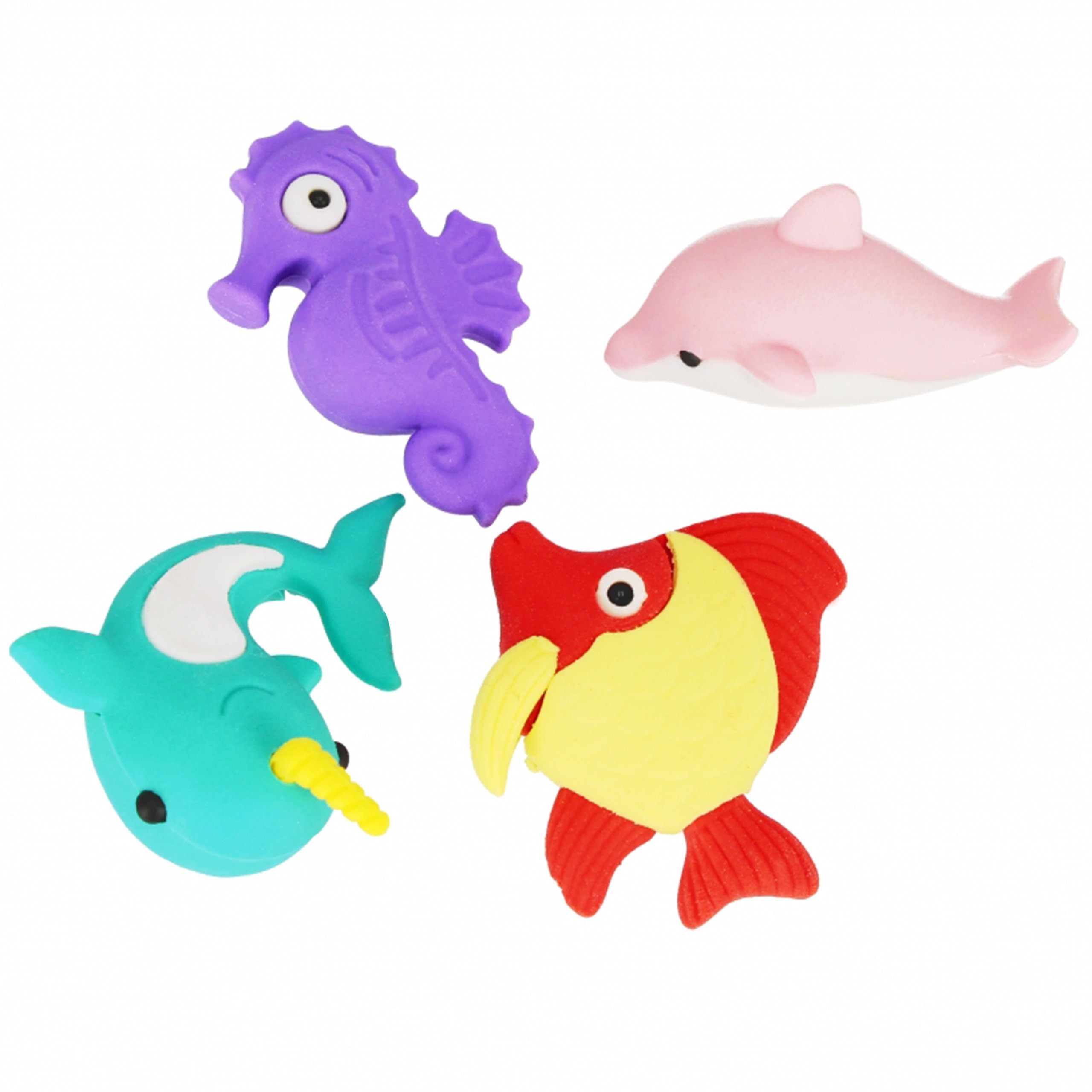 W zestawie znajdują się gumki w kształcie ryby, konika morskiego, delfina i narwala, które zachwycają żywymi kolorami oraz precyzyjnym wykonaniem.