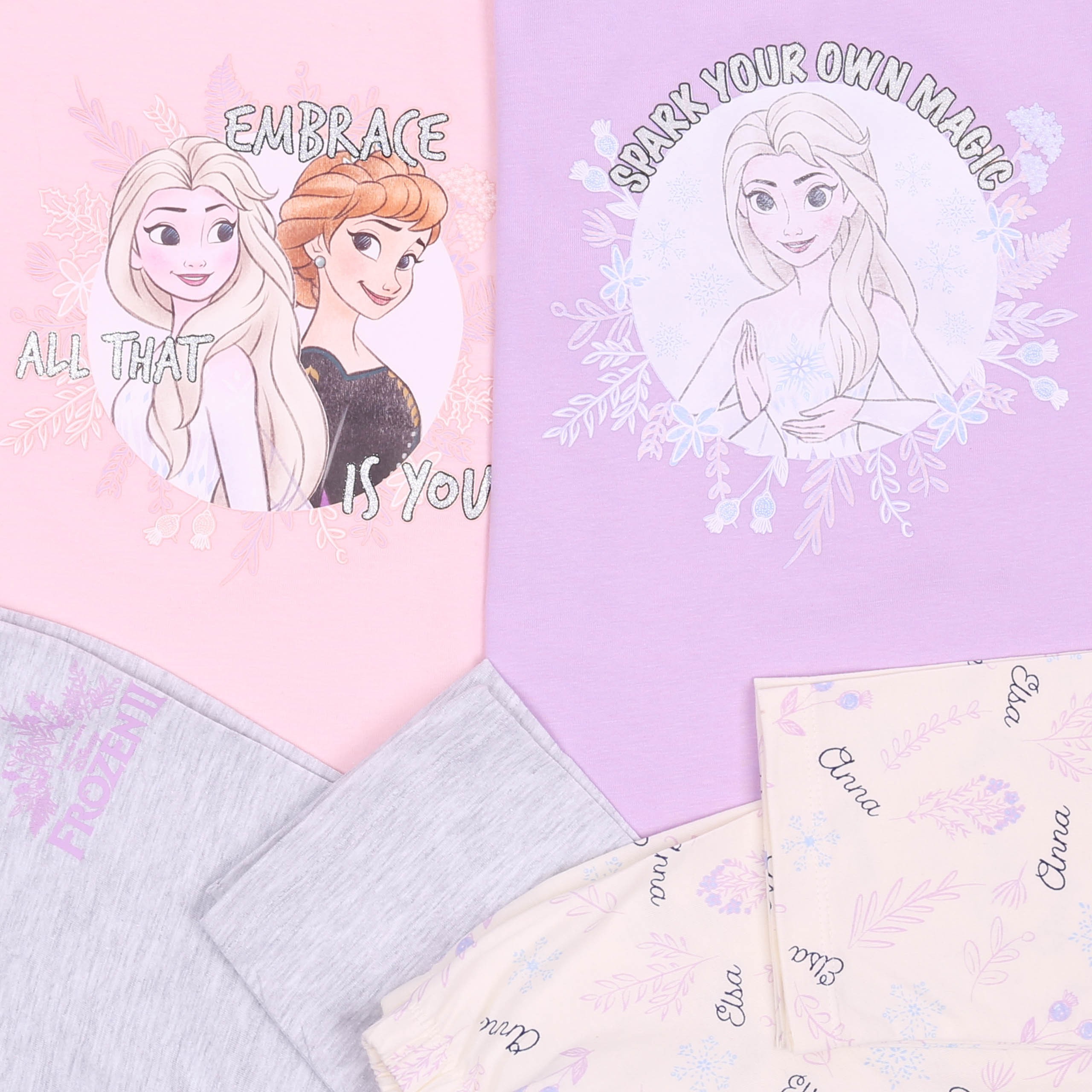 Zestaw dwóch, dwuczęściowych piżam dziewczęcych, w powtarzające się wizerunki głównych postaci filmu animowanego "Kraina Lodu".