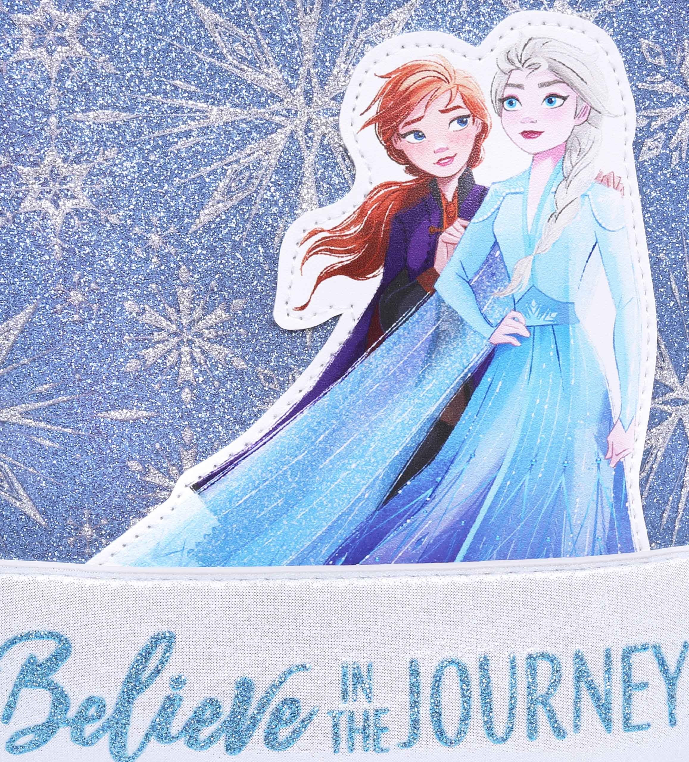 Błękitny, połyskujący plecak z brokatowymi elementami oraz naszywką wizerunków Anny i Elsy.