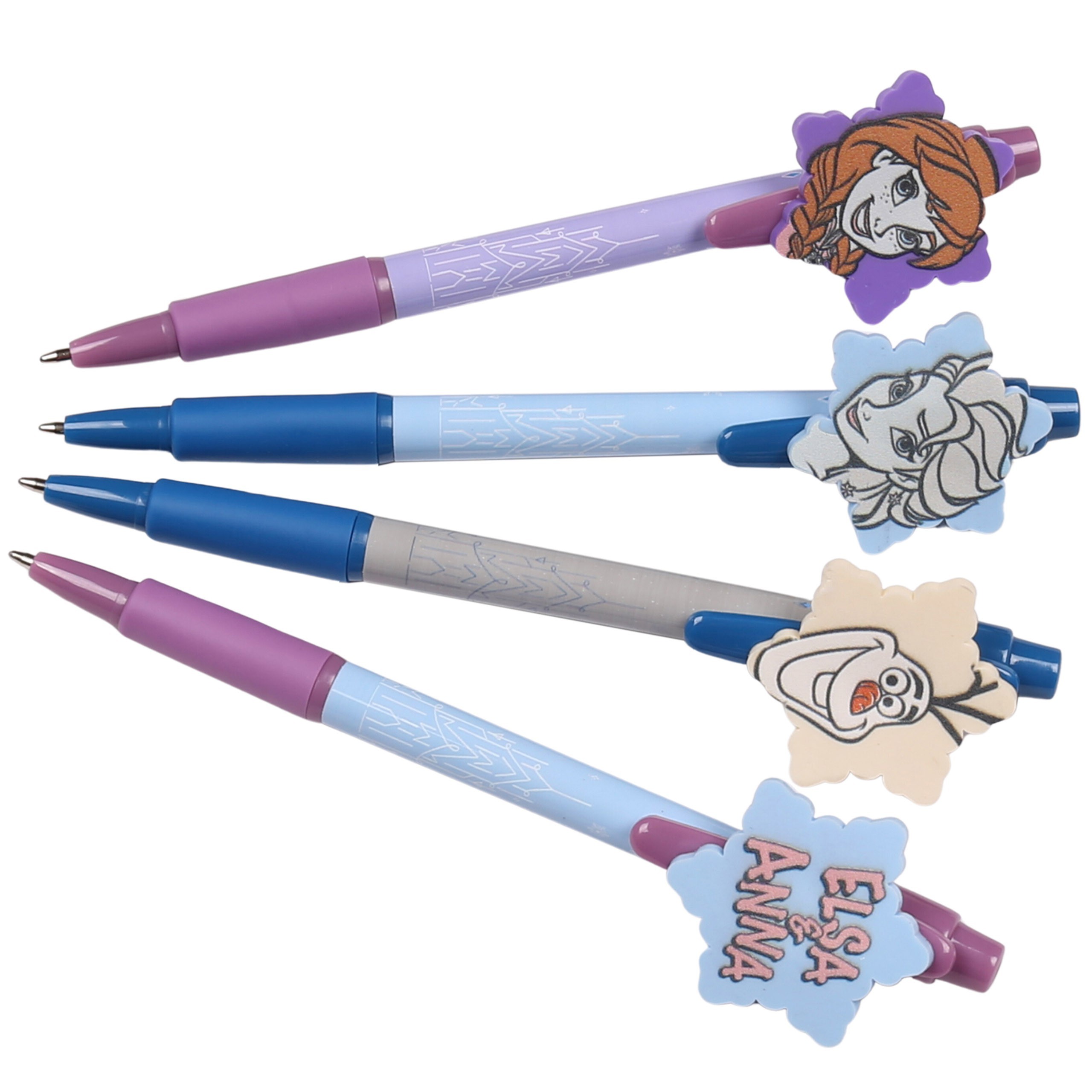 Każdy długopis w zestawie jest udekorowany postaciami lub wzorami z uwielbianego filmu Kraina Lodu.