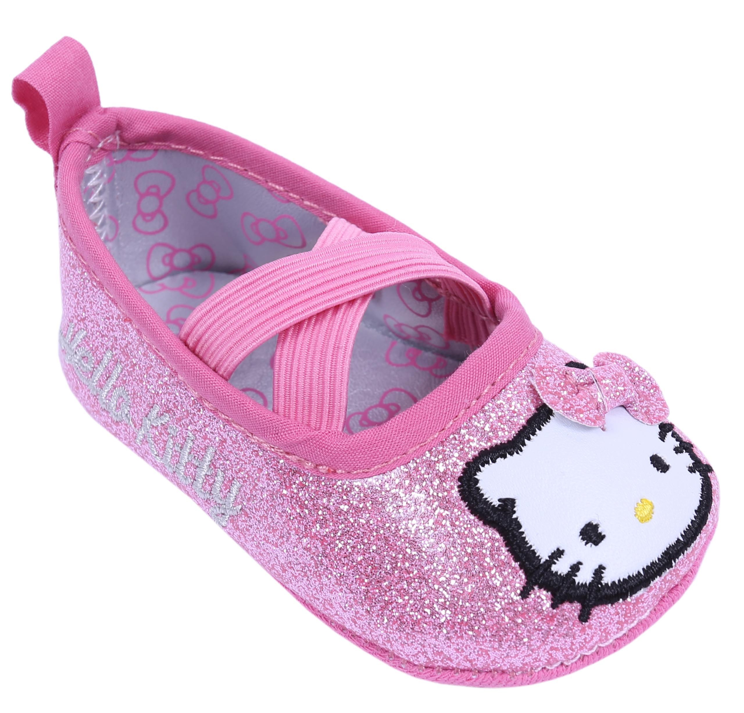 Różowe, błyszczące balerinki niemowlęce z motywem Hello Kitty.