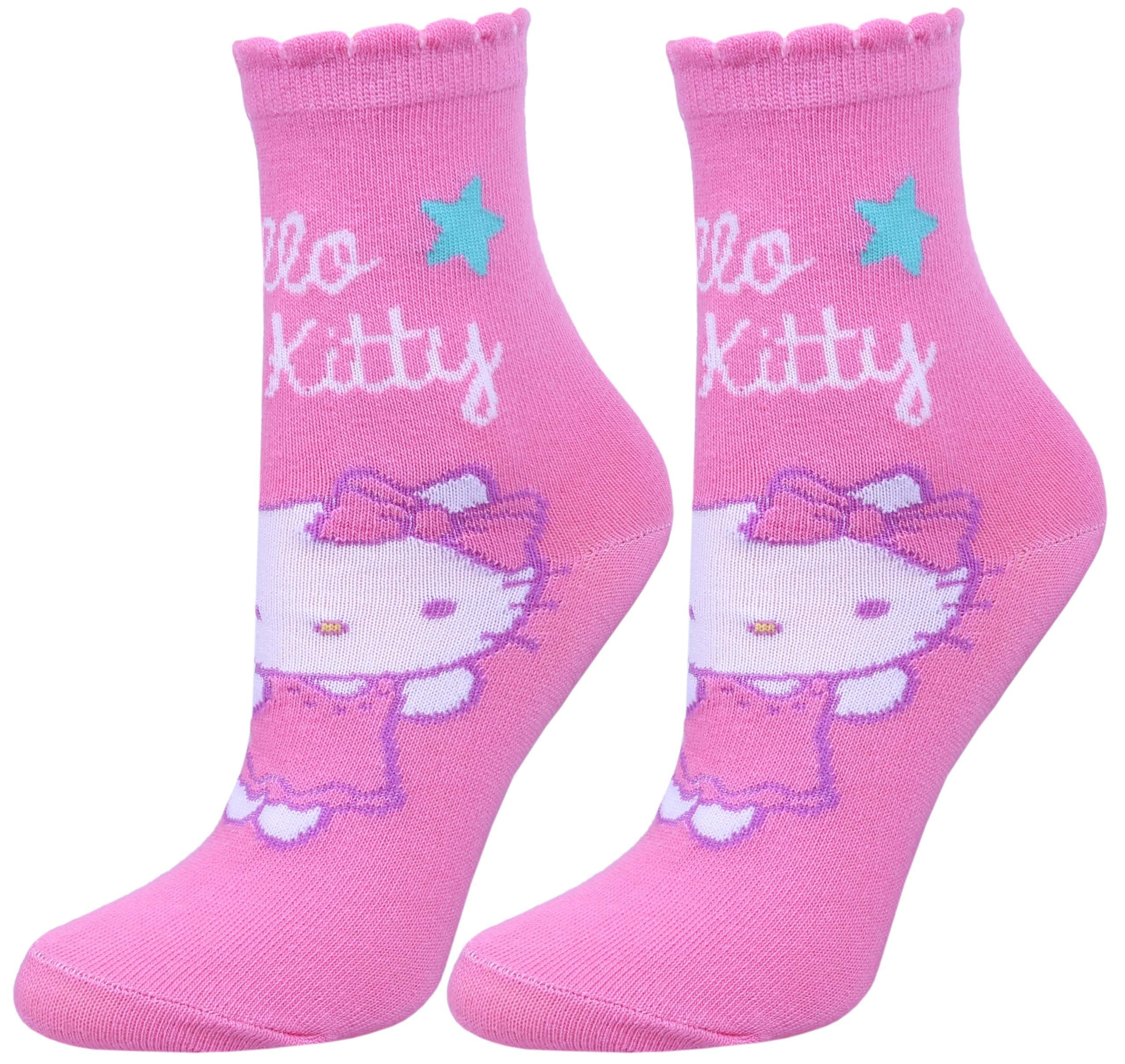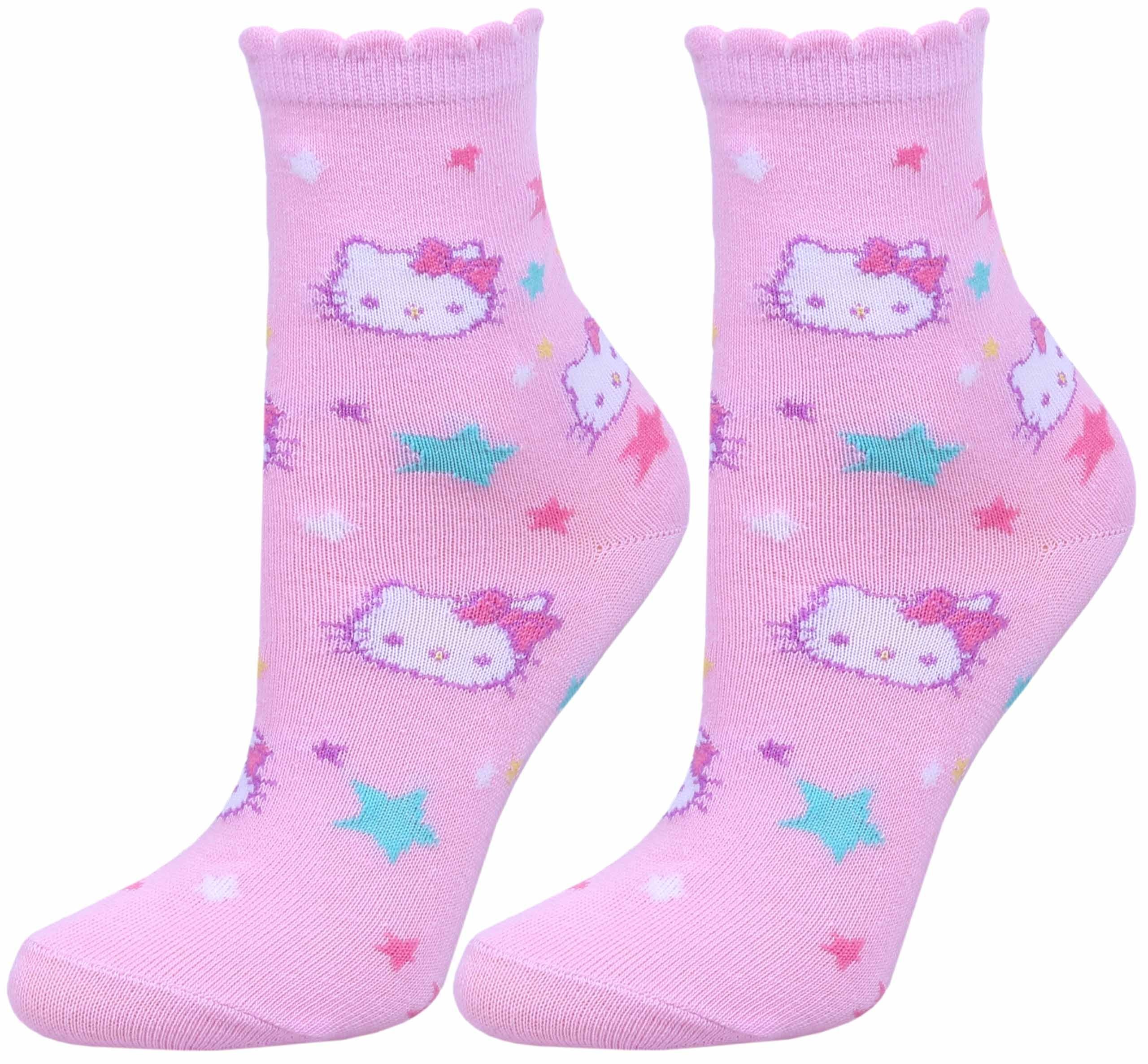 Jasnoróżowe skarpetki w gwiazdki i powtarzający się wizerunek Hello Kitty.