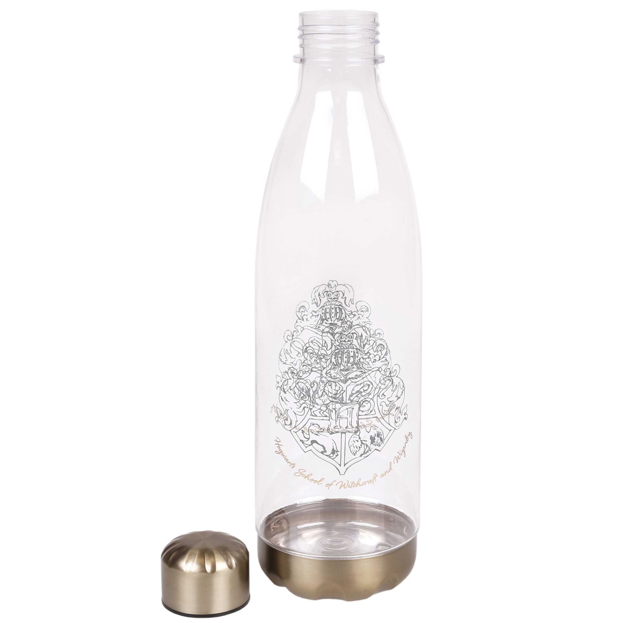 Butelka z nadrukami symboli Domów Szkoły Czarodziejstwa i Magii w Hogwarcie, metalowy spód oraz nakrętka.