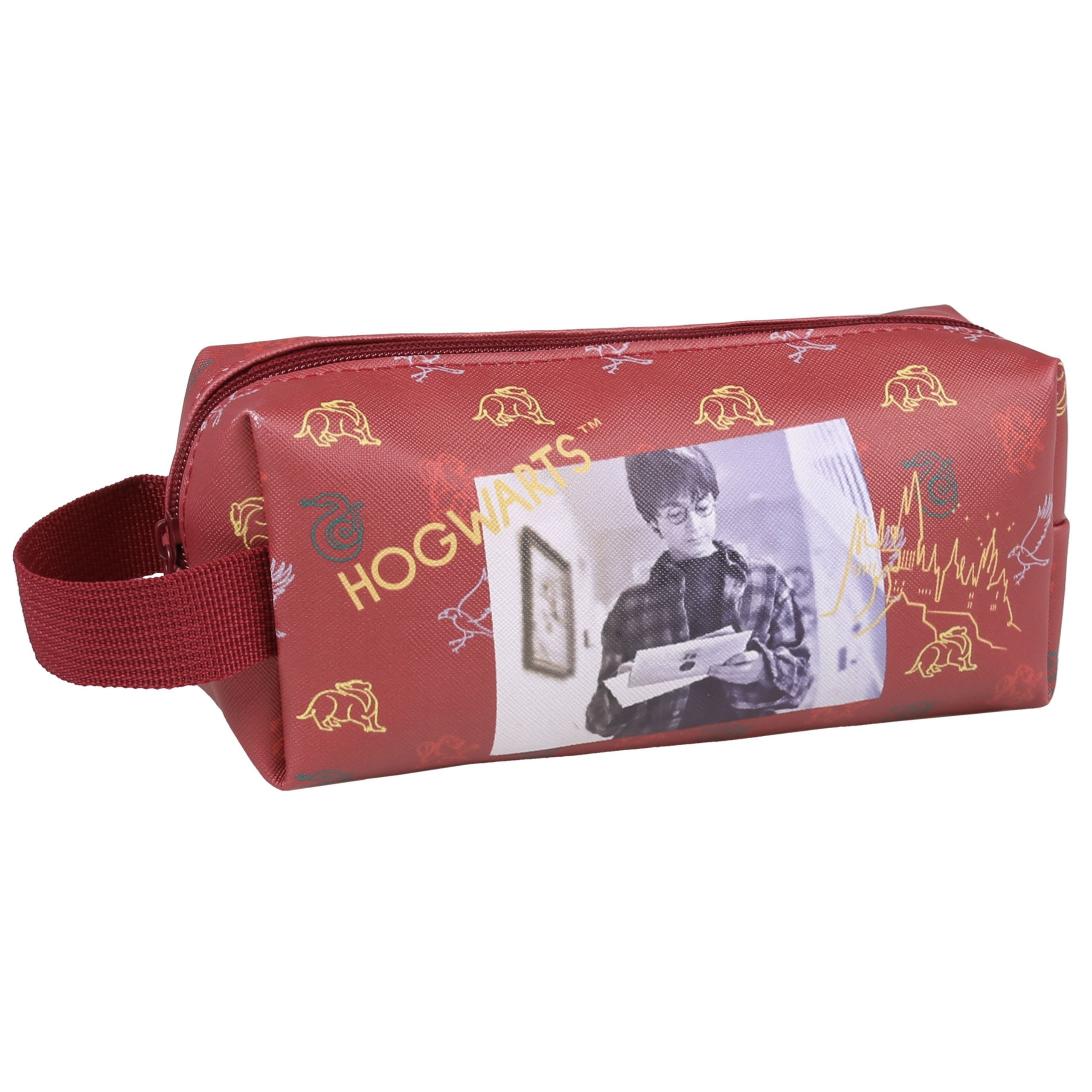 Bordowy, jednokomorowy piórnik zapinany na zamek, w powtarzające się nadruki z motywem Harrego Pottera.