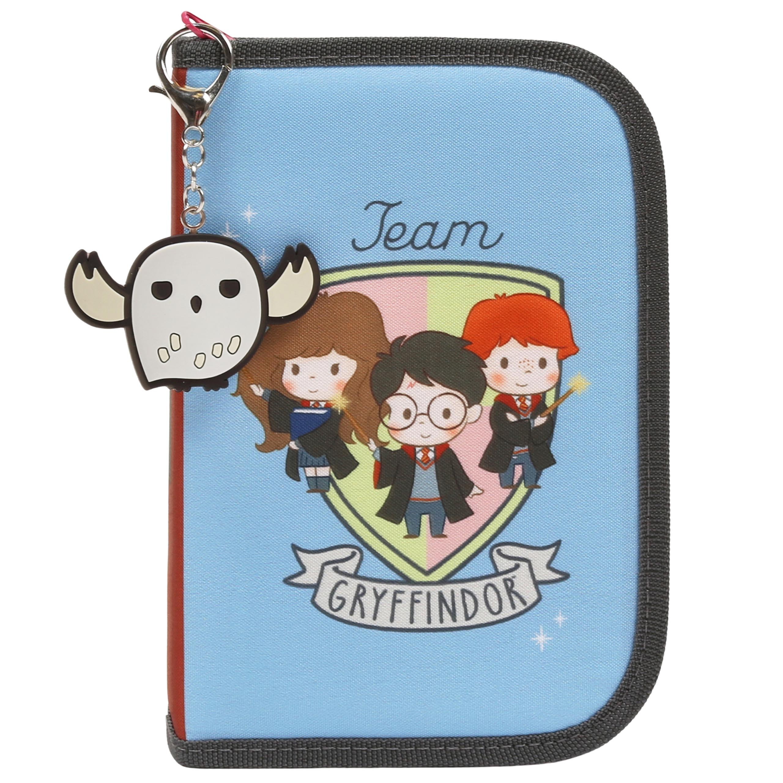 Niebieski, jednoklapowy piórnik z wyposażeniem i nadrukiem z postaciami z filmu "Harry Potter" to niezbędny dodatek do wyprawki szkolnej Twojej pociechy.