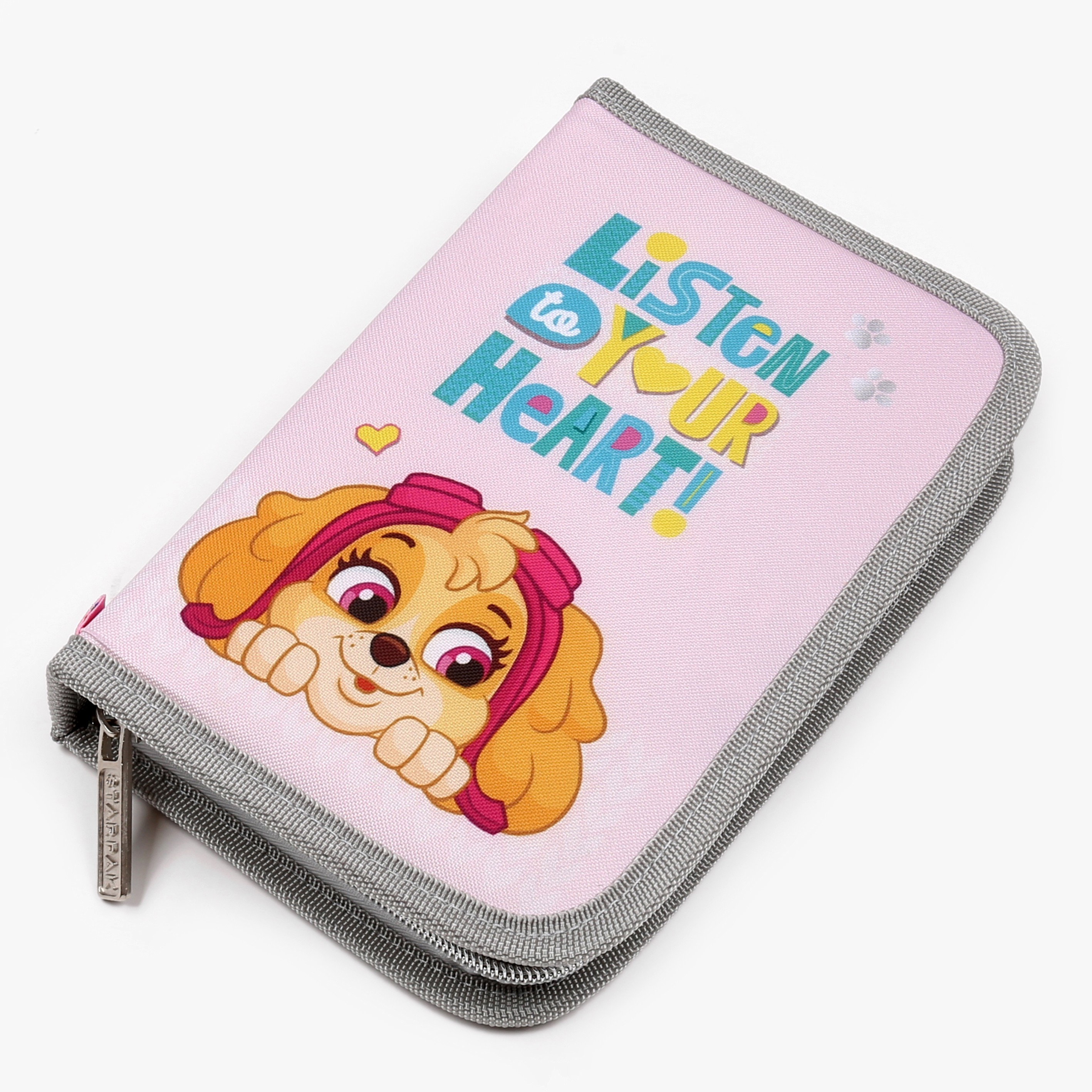 Różowo-szary piórnik zapinany na zamek, z nadrukiem wizerunku postaci serialu animowanego "Psi Patrol" - Skye.