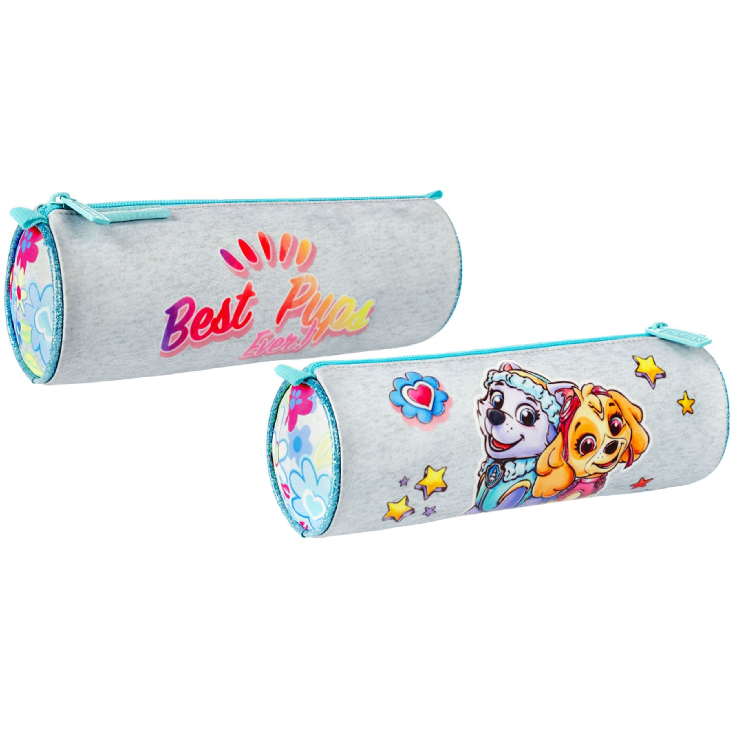 Szary, jednokomorowy piórnik zapinany na zamek, z nadrukiem wizerunków postaci serialu animowanego "Psi Patrol" - Skye i Everest.