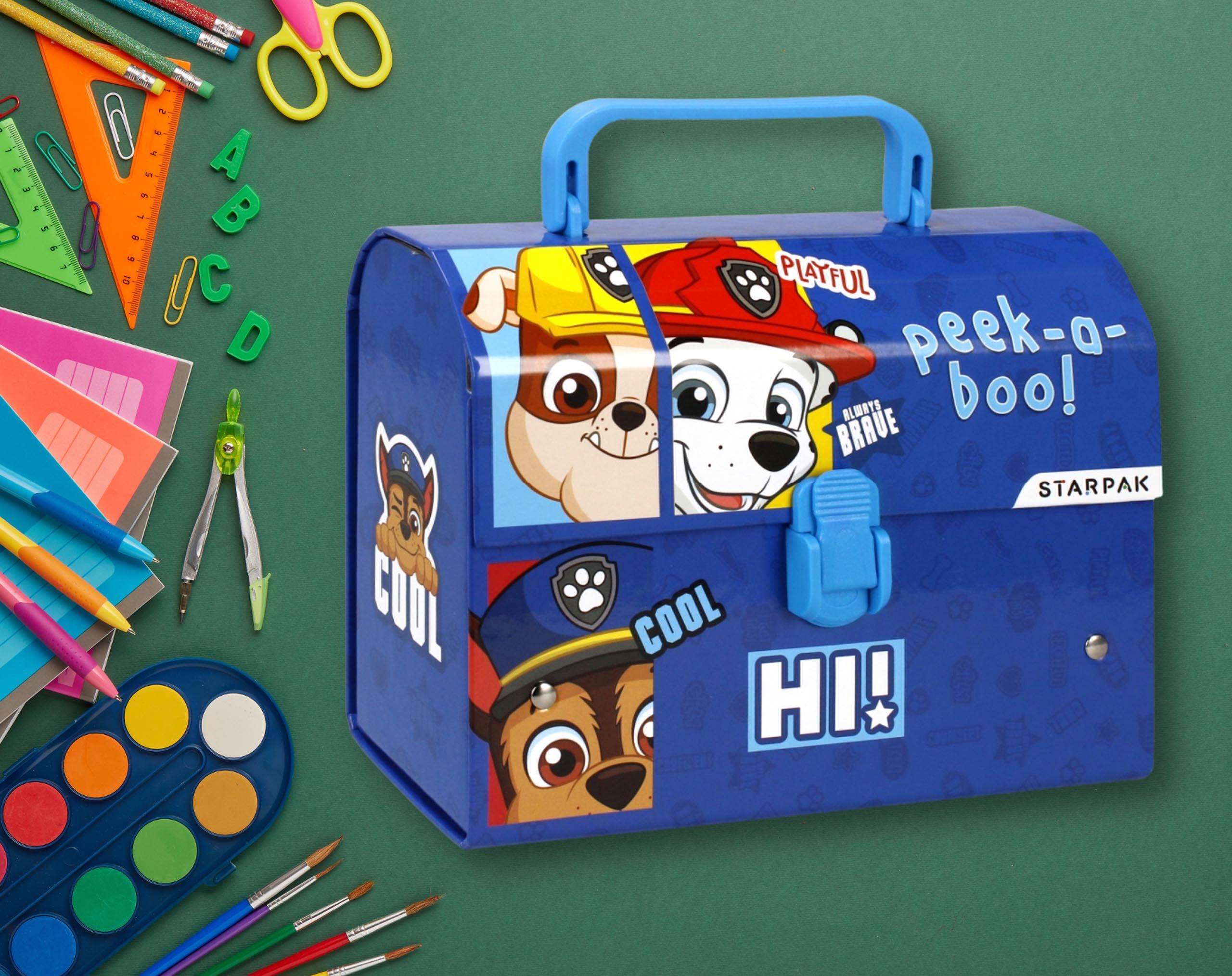 Sztywny kuferek kartonowy w niebieskim kolorze z nadrukami wizerunków piesków serialu animowanego "Psi Patrol" - Chase, Marshall, Rubble.