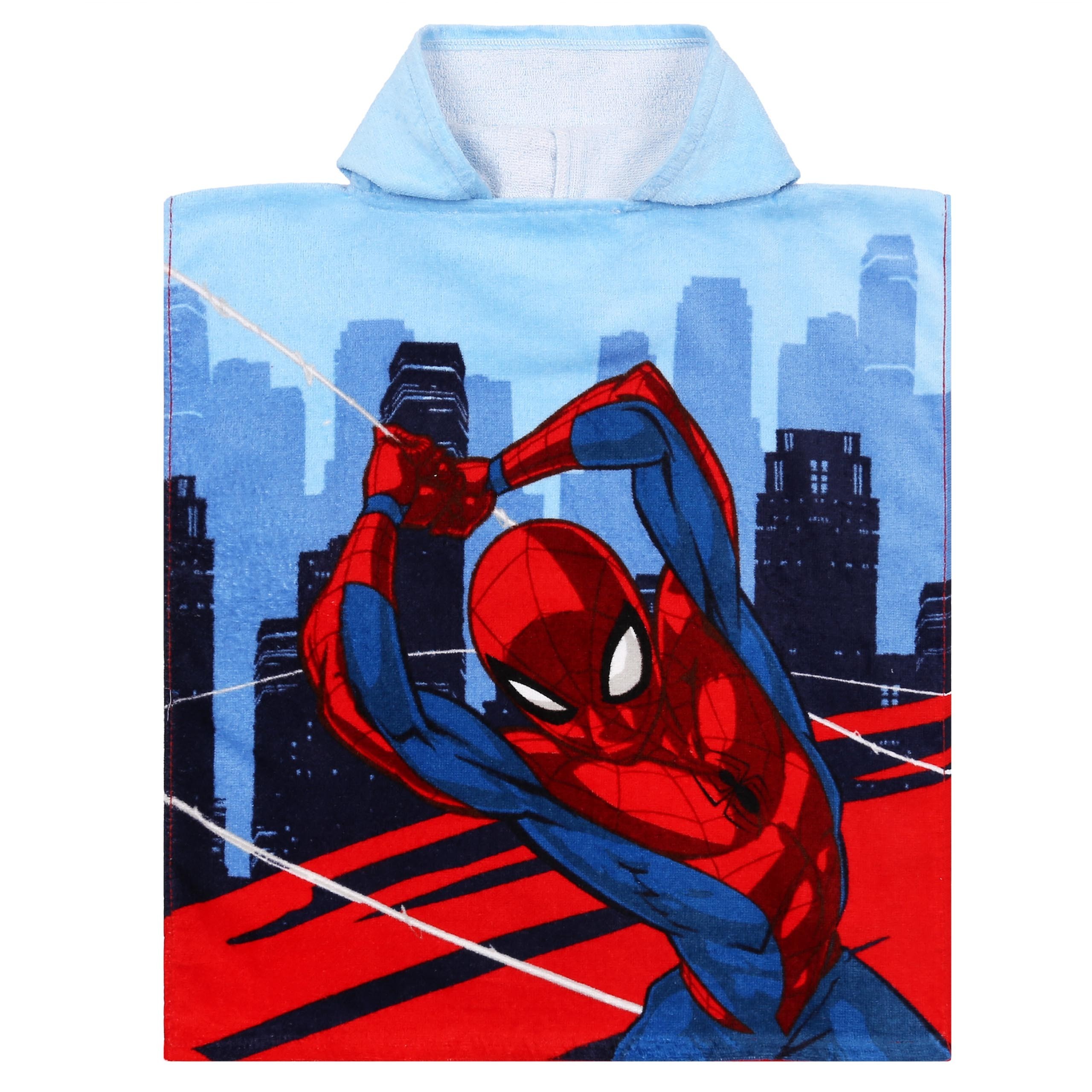 Kolorowy nadruk przedstawiający Spider-Mana w akcji na tle miejskiego krajobrazu dodaje ręcznikowi dynamicznego uroku.