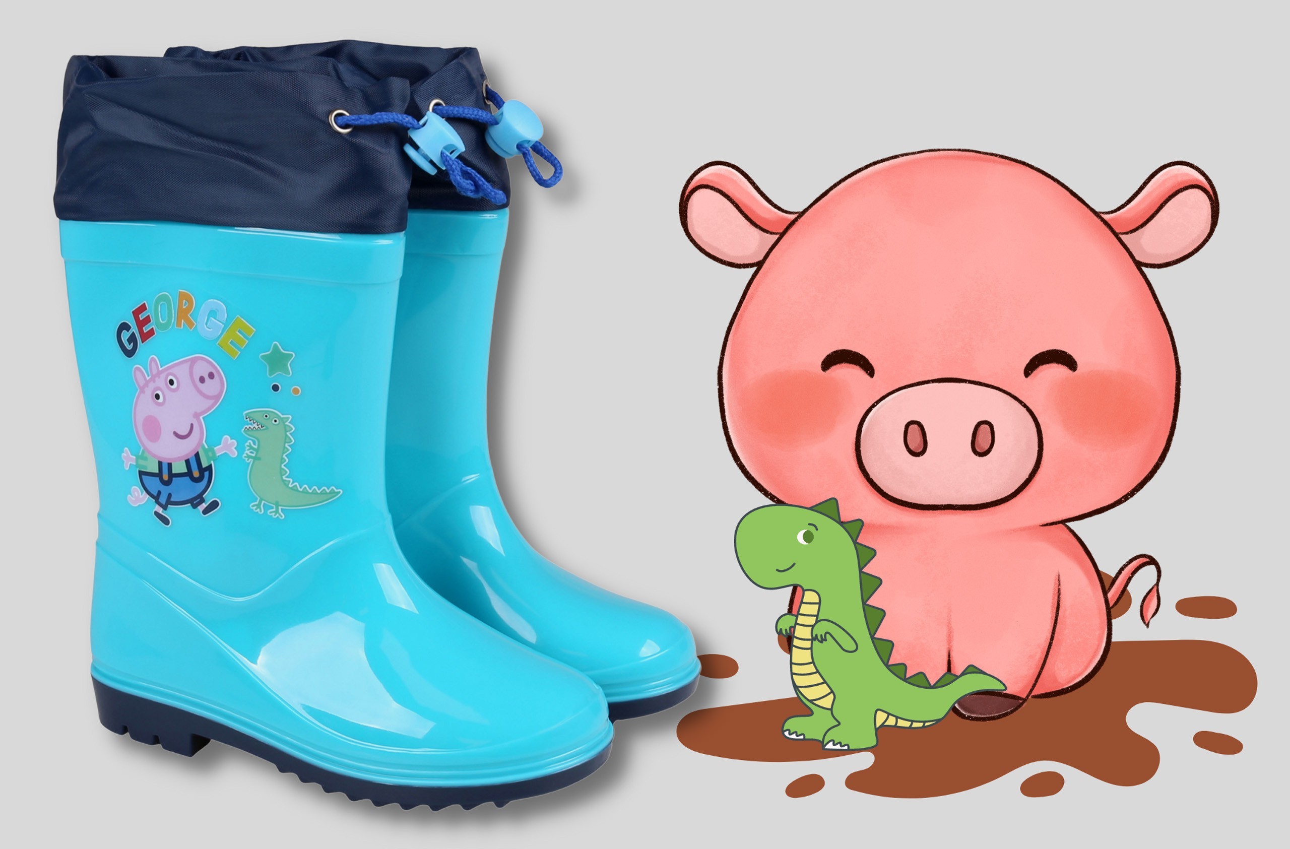 Chłopięce kalosze przeciwdeszczowe do połowy łydki, w kolorze niebieskim, z wizerunkiem Georga, postaci z filmu animowanego "Świnka Peppa".