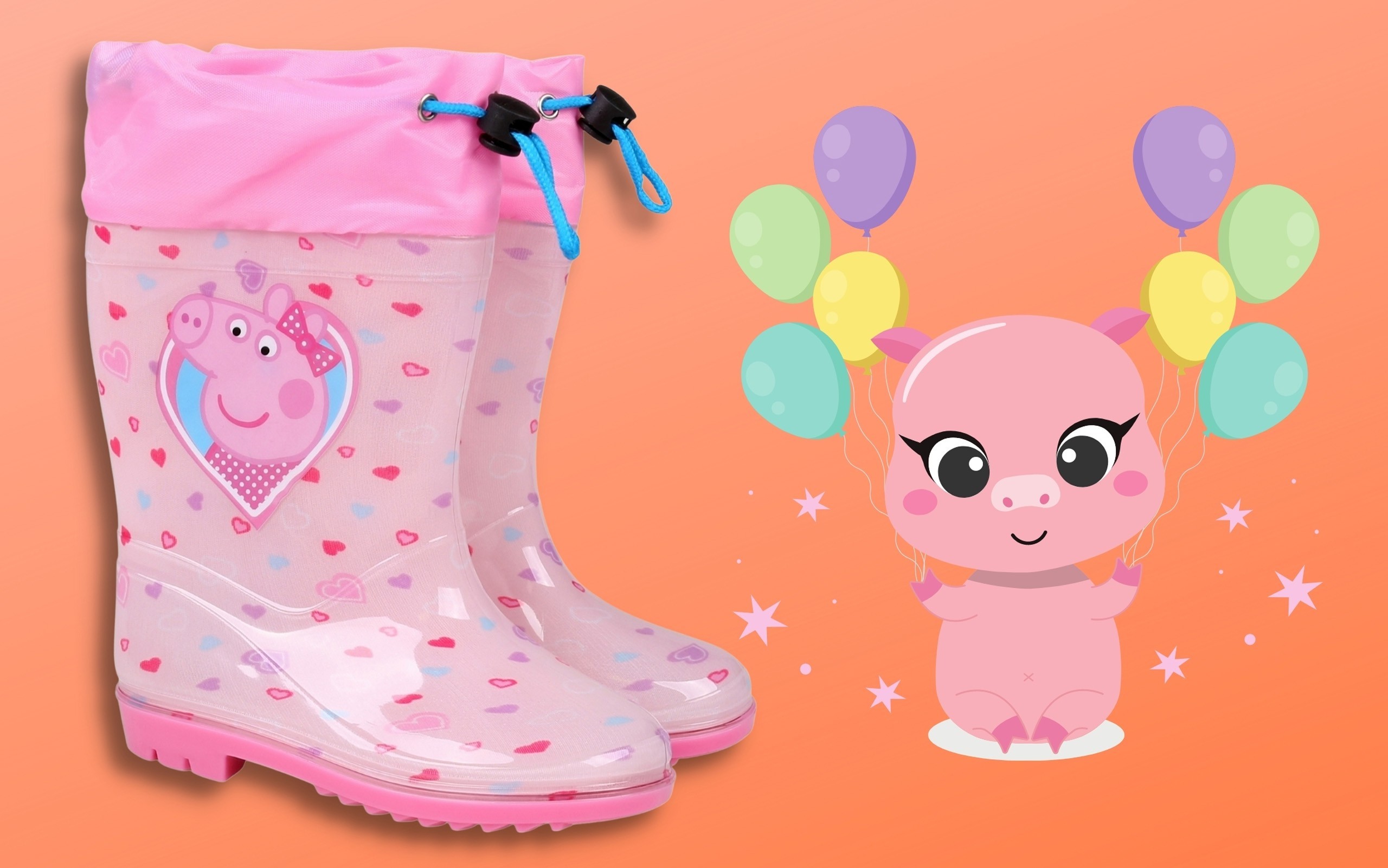 Dziewczęce kalosze przeciwdeszczowe do połowy łydki, w kolorze różowym, z motywem Świnki Peppy.