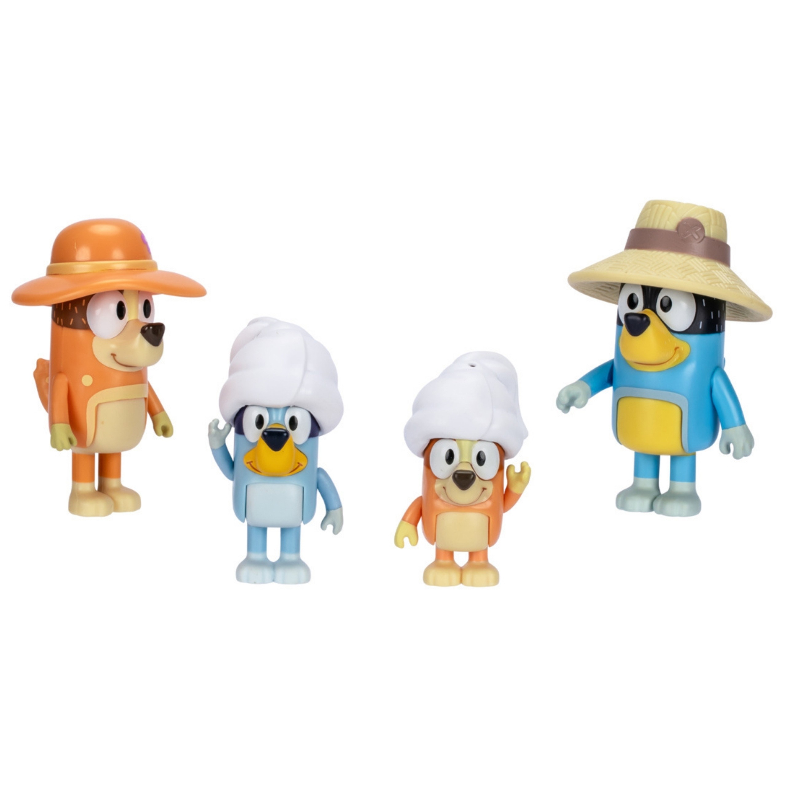 W zestawie znajdują się cztery figurki przedstawiające postacie Bluey i jej rodziny w podróżniczych strojach.
