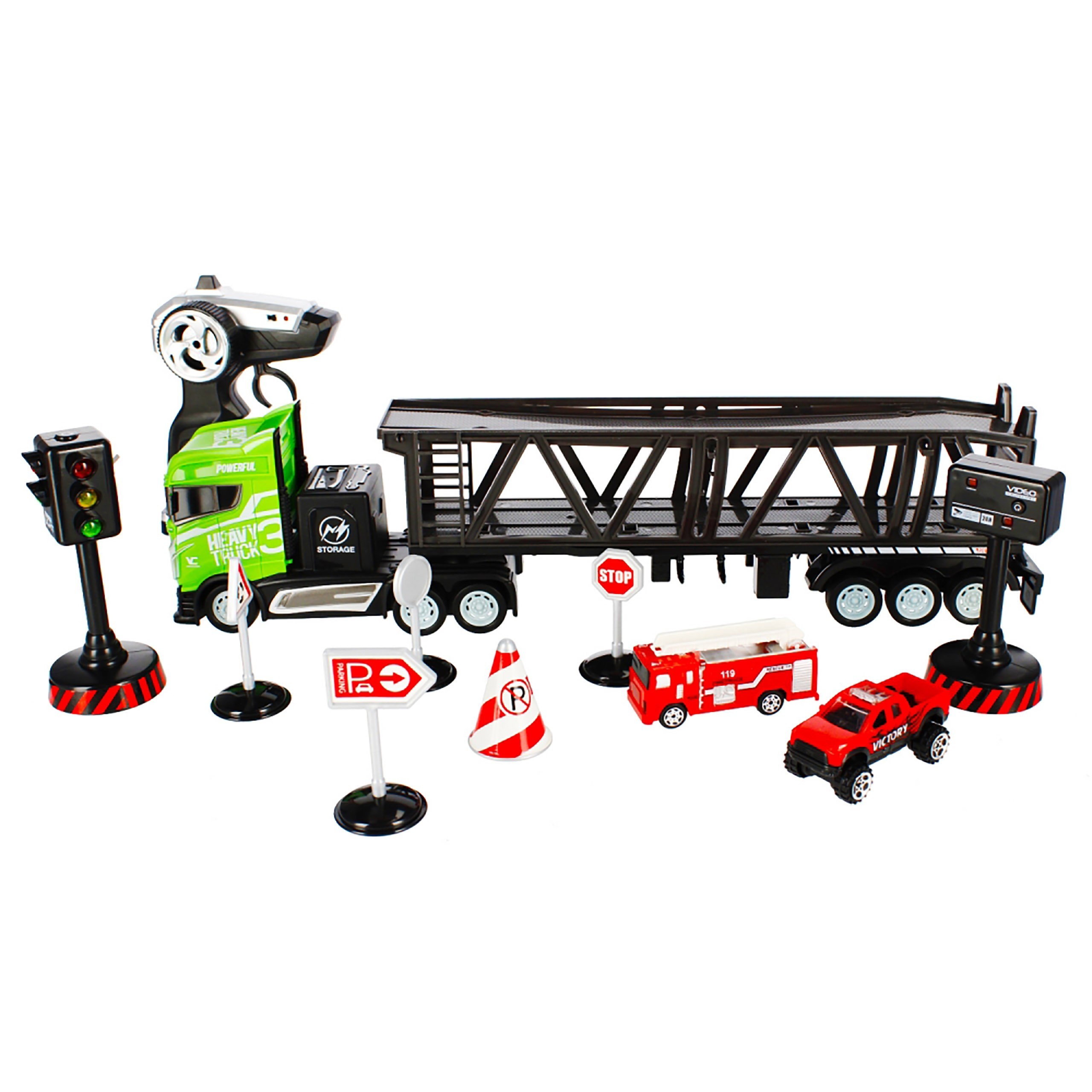 Zestaw zawiera auto ciężarowe lawetę, pilot do sterowania, dwa małe samochody ciężarowe Straży Pożarnej, jeden mały samochód osobowy Straży Pożarnej, znaki drogowe, sygnalizację świetlną oraz fotoradar.