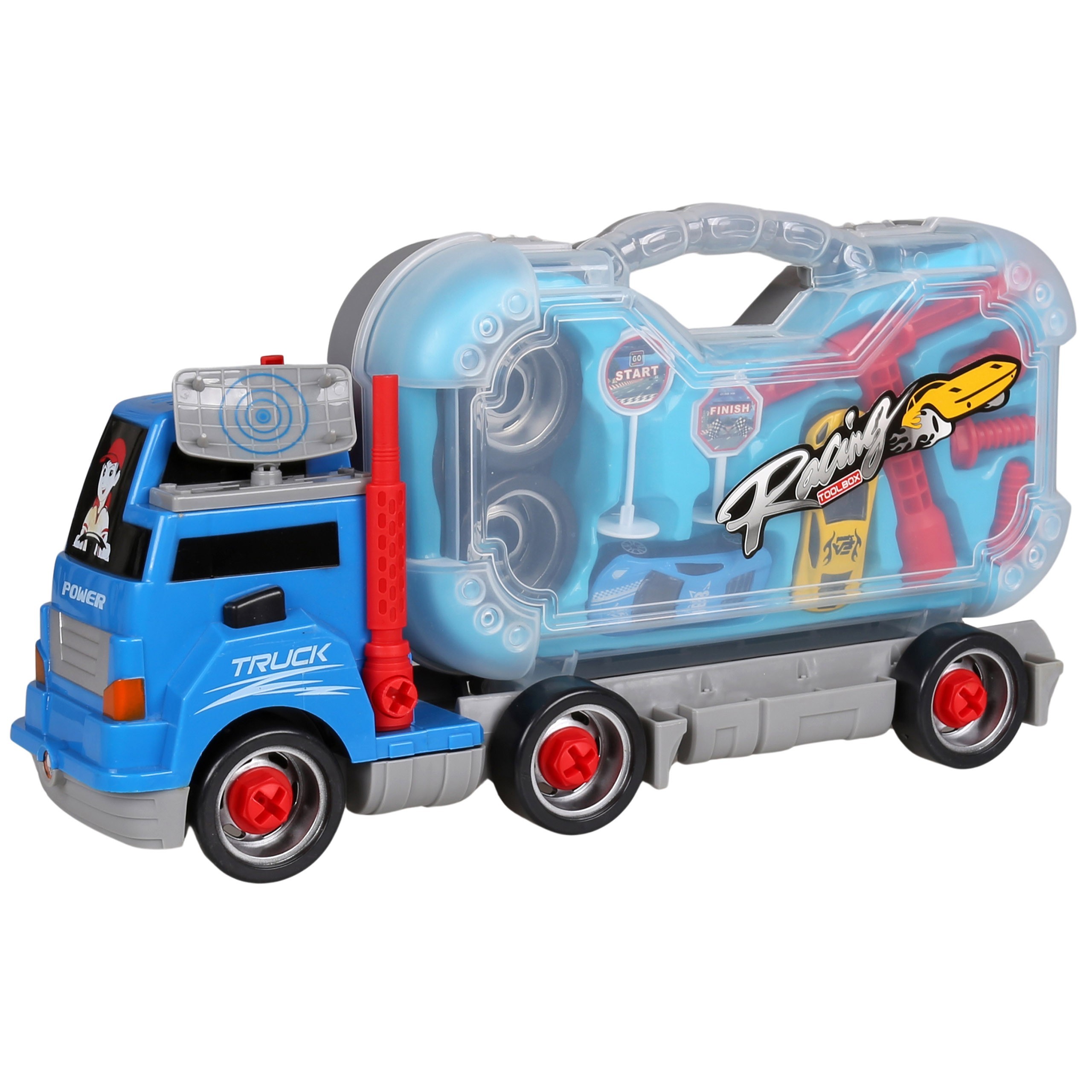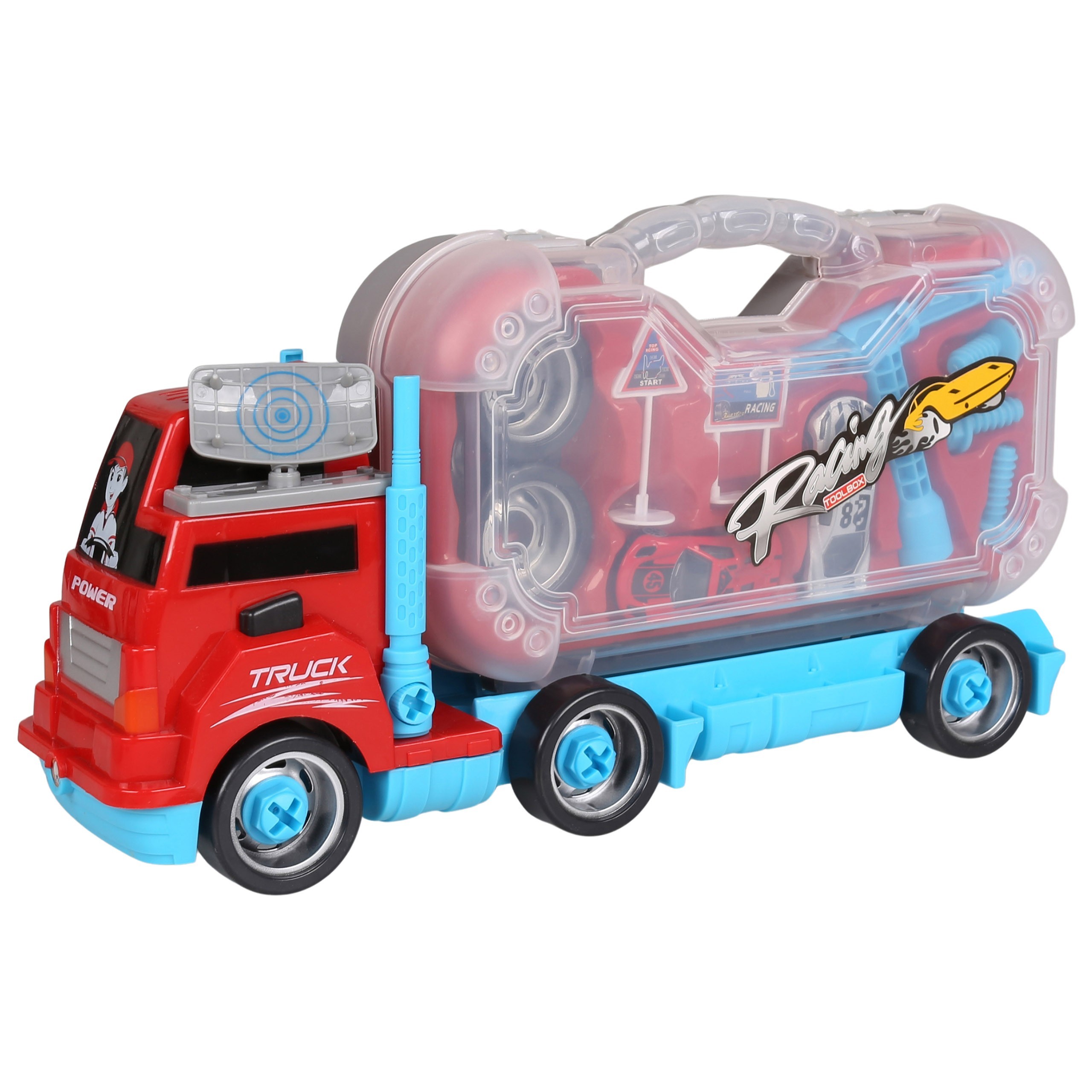 Zestaw zawiera samochód, lawetę do skręcania, narzędzia, śrubki, wkrętki oraz dodatkowe akcesoria motoryzacyjne i dwie małe resorówki.