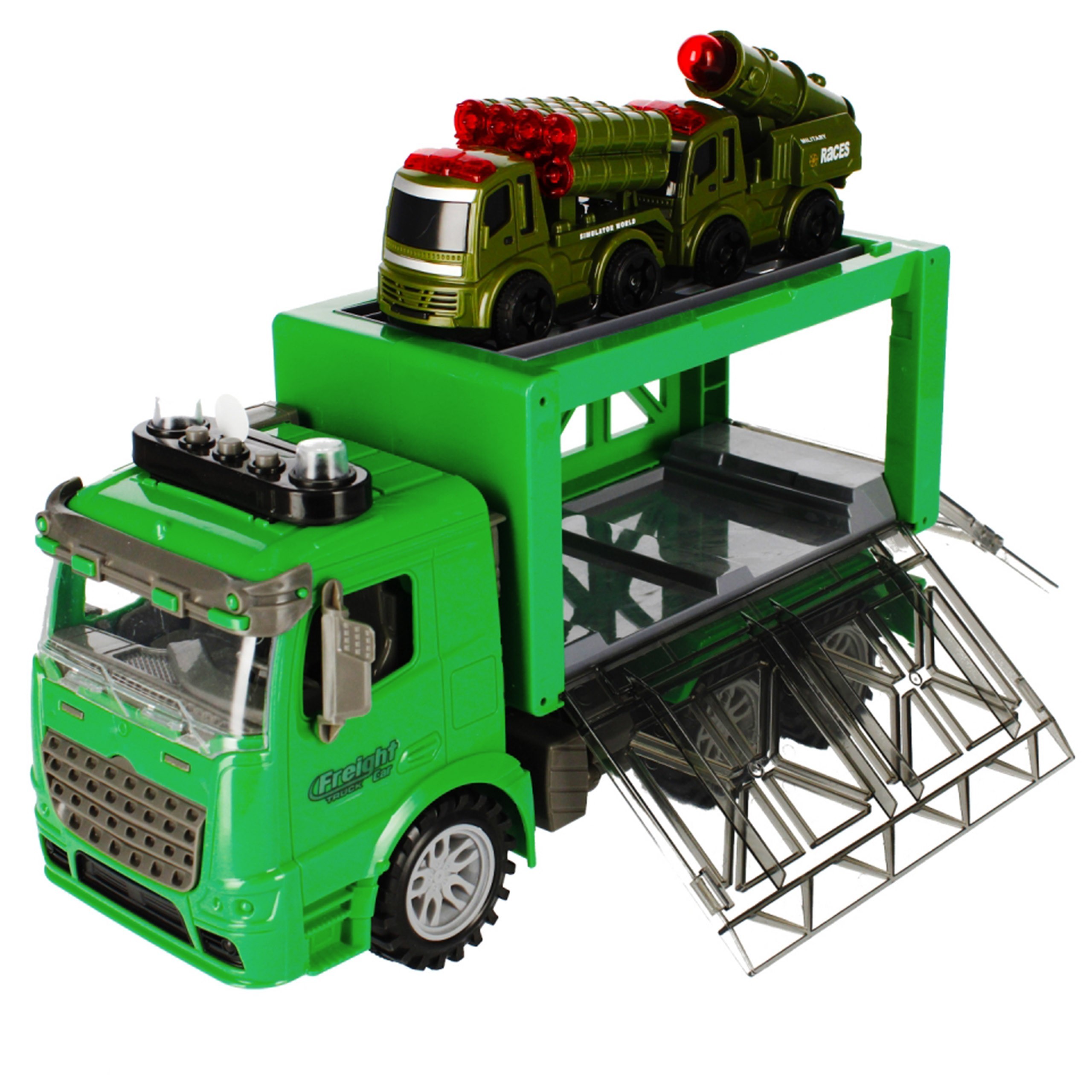 Ciężarówka posiada kontener-lawetę na trzy samochody oraz ruchome elementy, w tym otwierany kontener, który umożliwia swobodne wjazdy i wyjazdy autek.