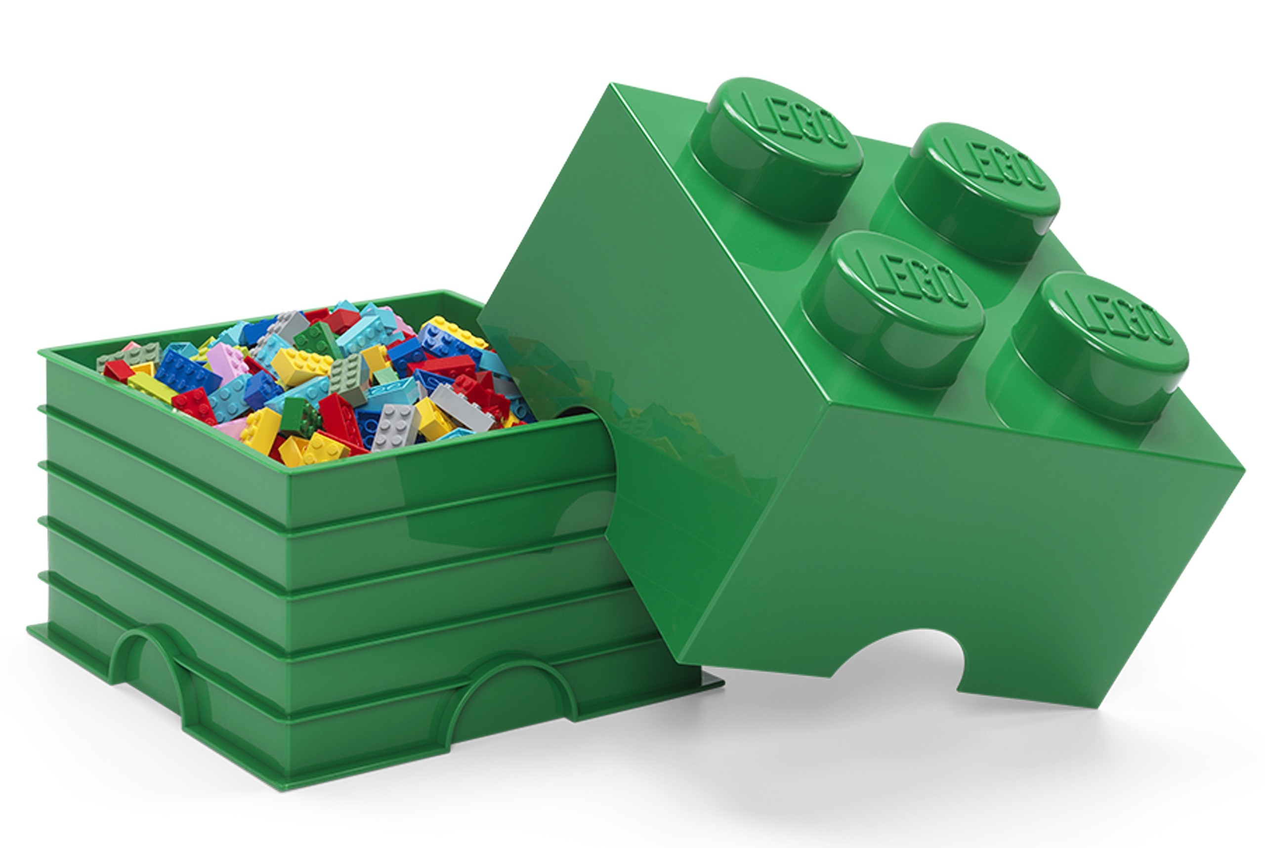 Duży, zielony, kwadratowy pojemnik w kształcie klasycznego klocka LEGO.