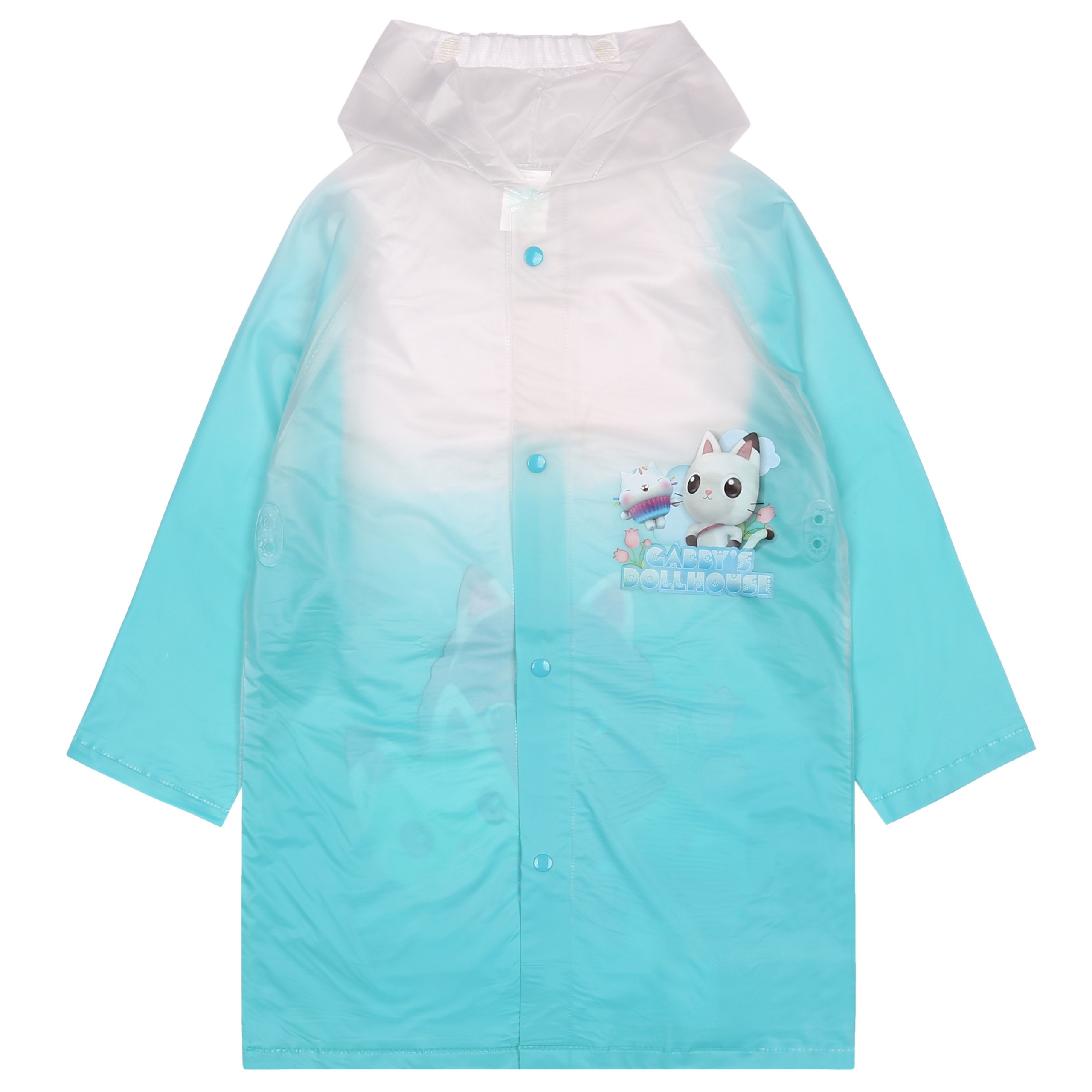 Praktyczny i stylowy płaszcz przeciwdeszczowy w kolorze niebiesko-białym inspirowany bajką Gabby's Dollhouse.