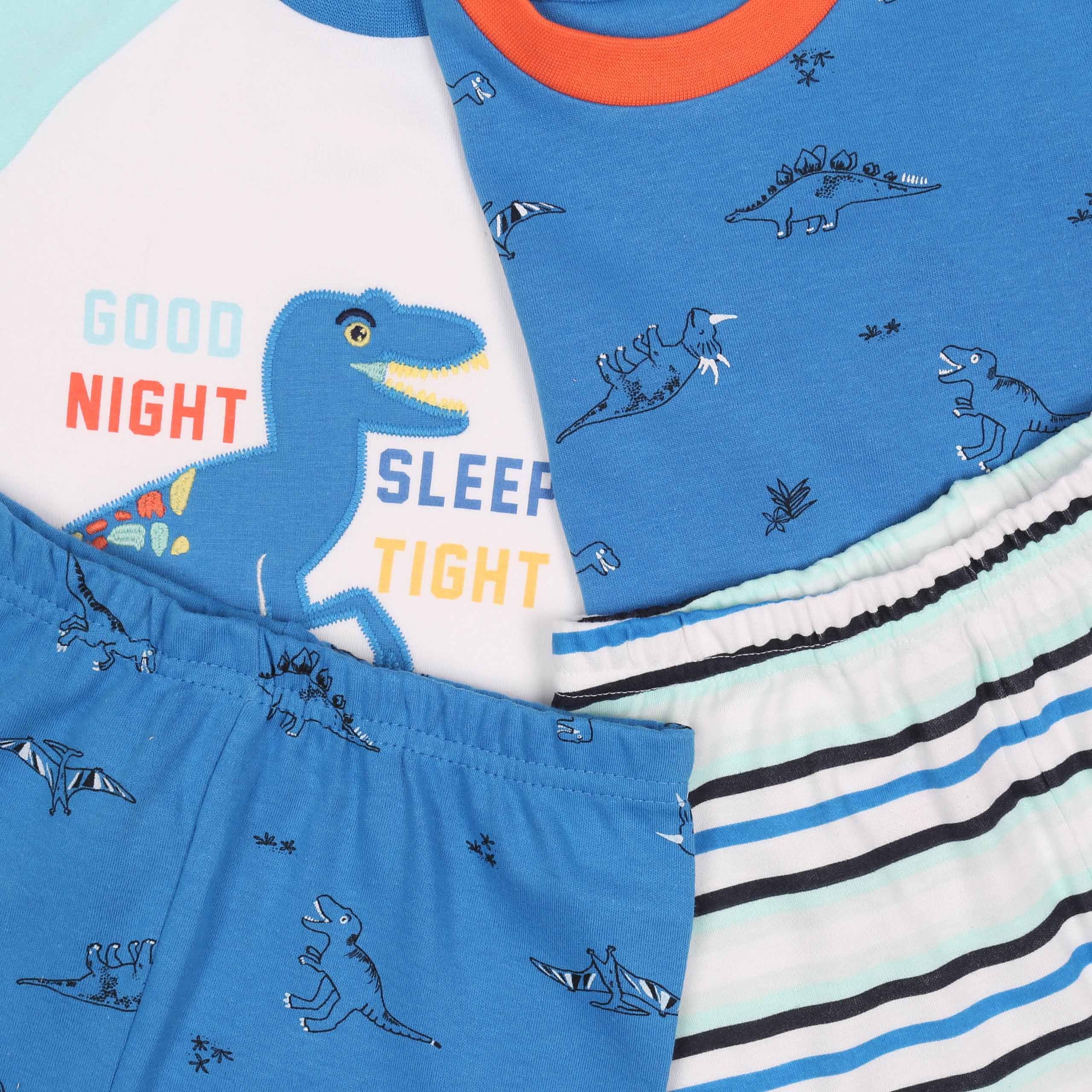 Zestaw dwóch, dwuczęściowych piżam chłopięcych, z motywem dinozaurów.