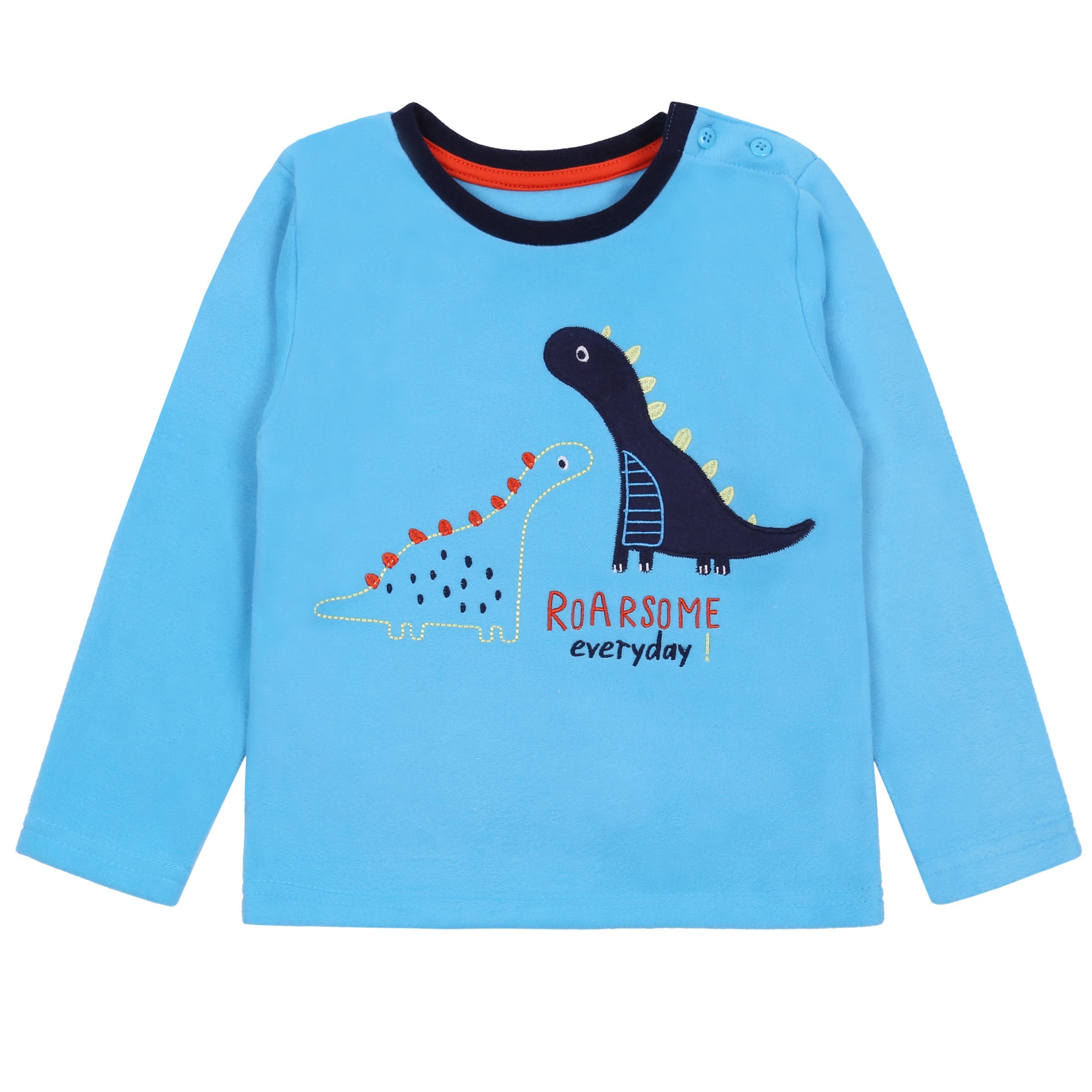 Niebiesko-szara piżama polarowa w powtarzające się wizerunki kolorowych dinozaurów.