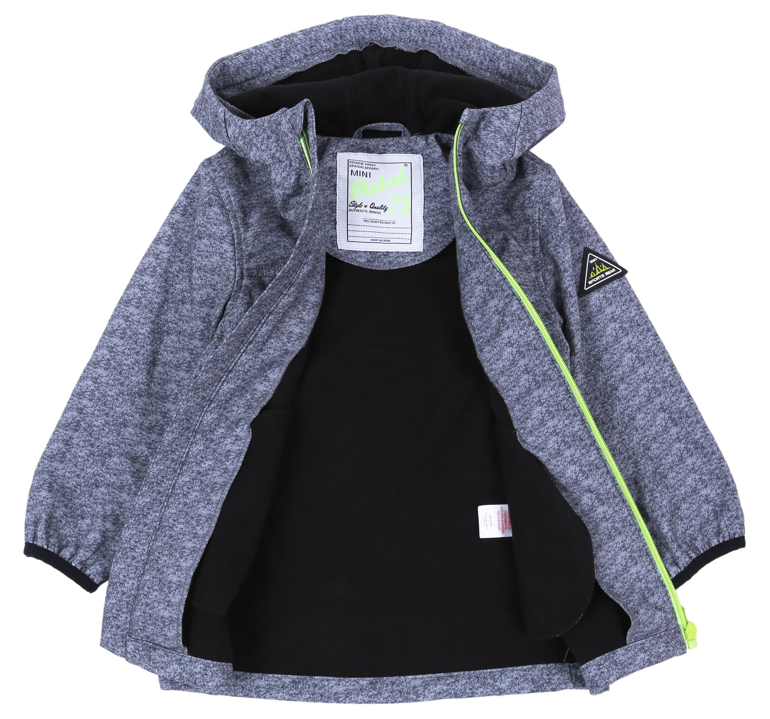 Szara, melanżowa kurtka, z kapturem i zielono neonowymi elementami.