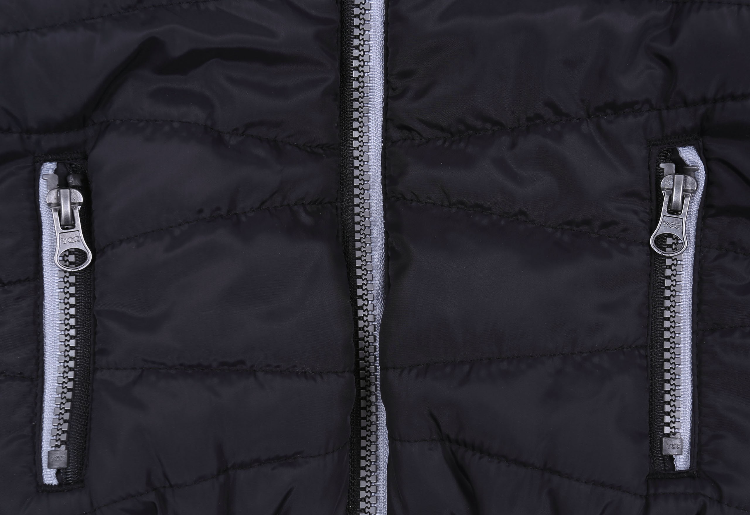 Czarna, zimowa kurtka z szarymi, odblaskowymi elementami.