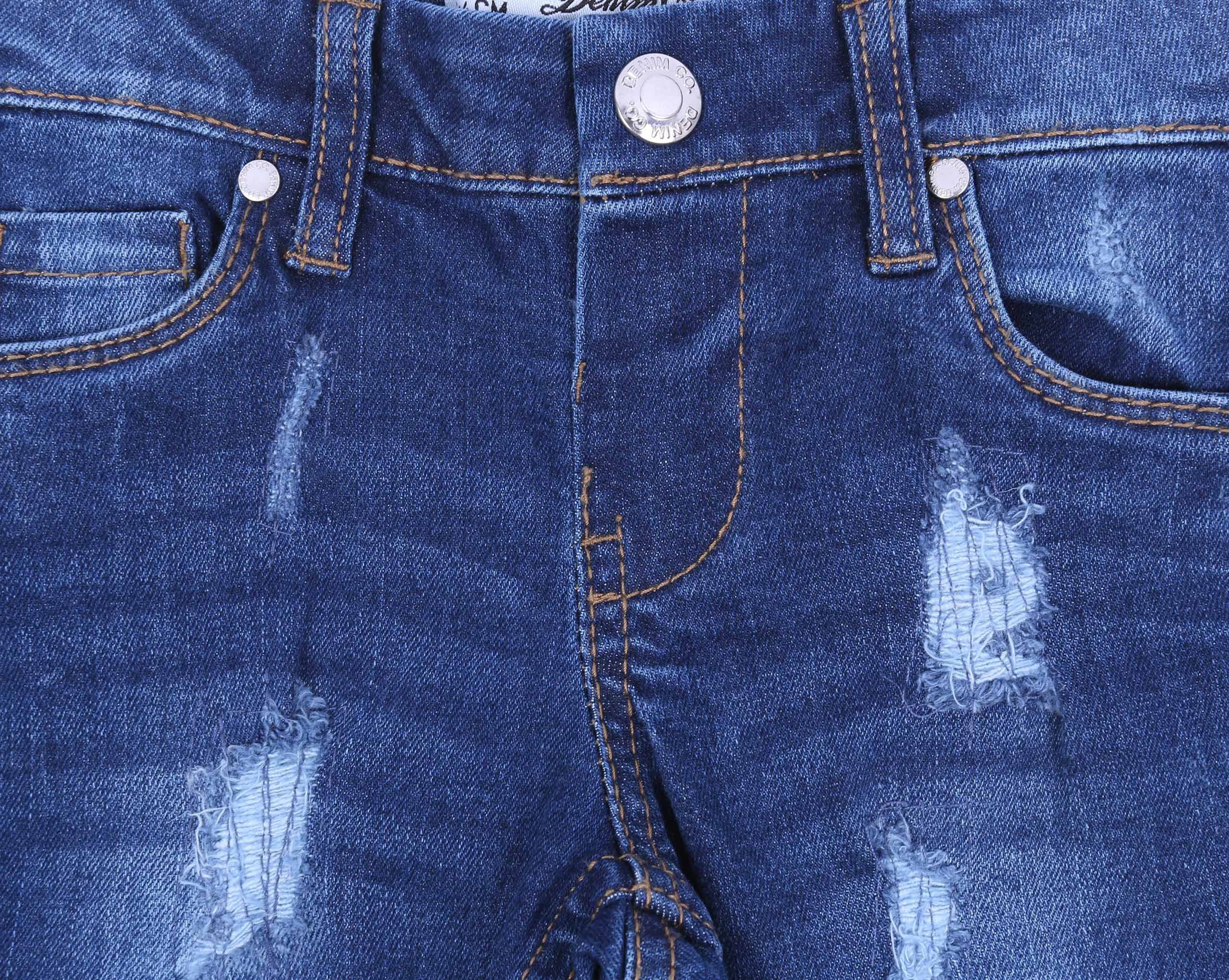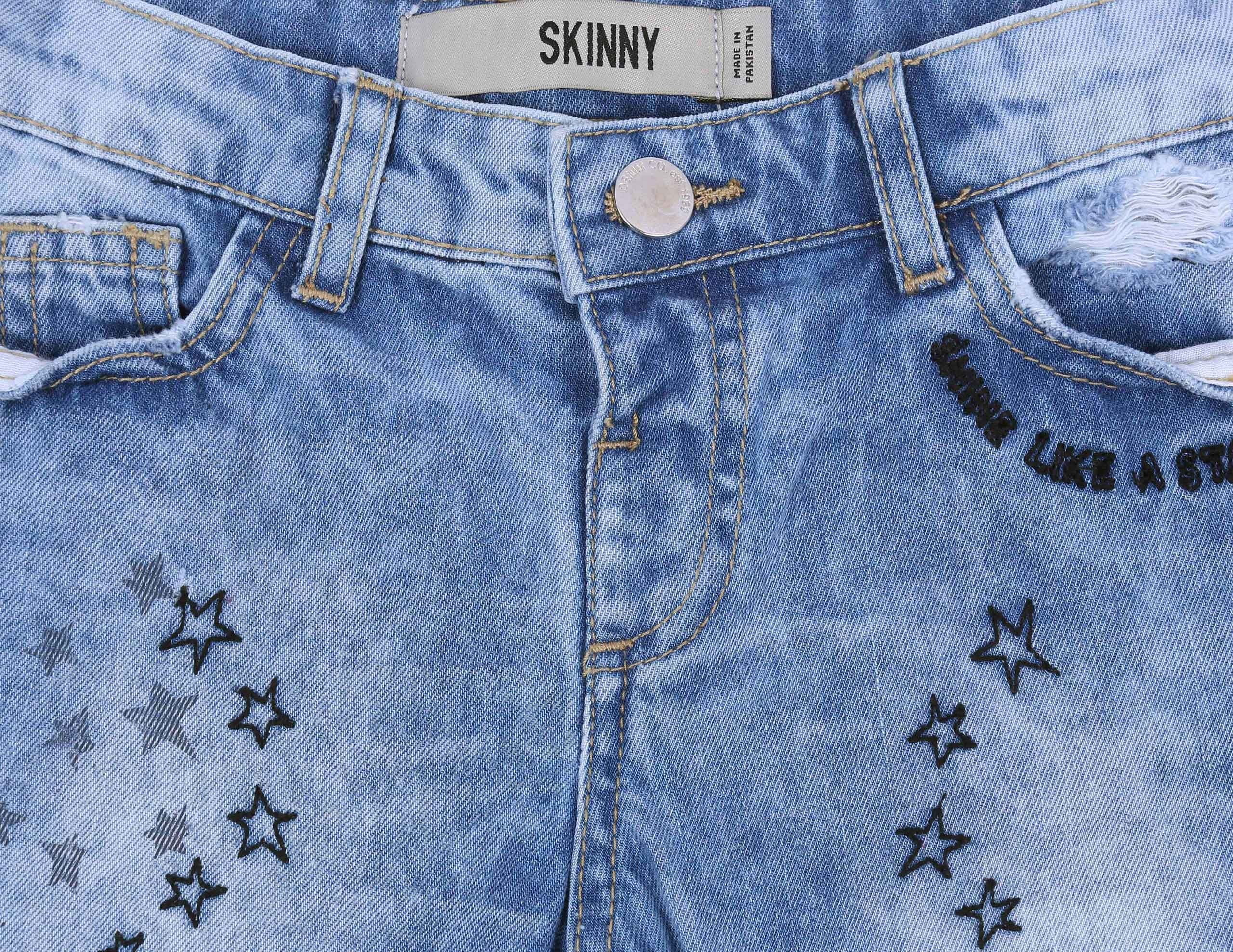 Z przodu spodnie posiadają modne przetarcia, dziury oraz gwiazdki.