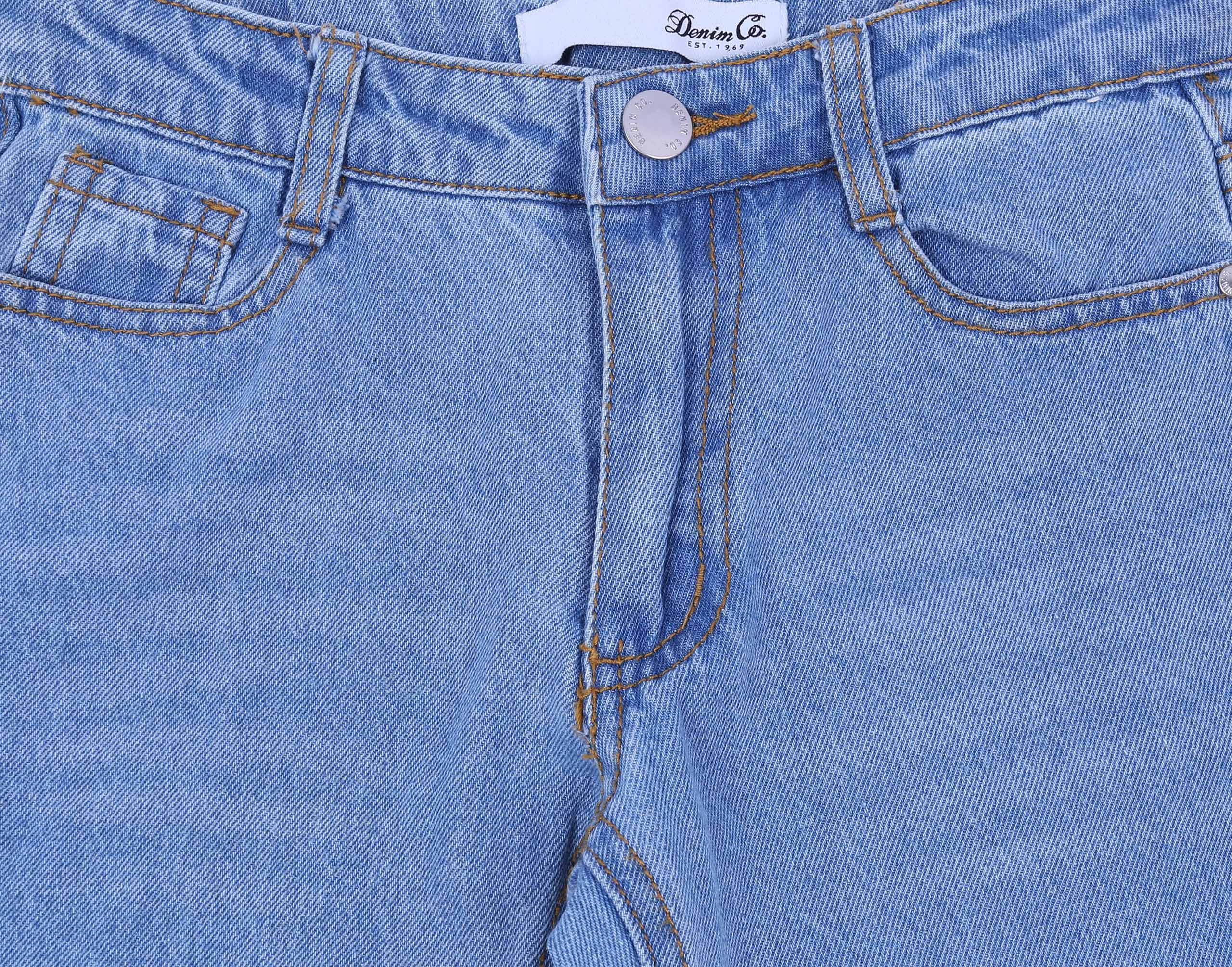 Jasnoniebieskie, jeansowe spodnie dziewczęce, z prostą nogawką.