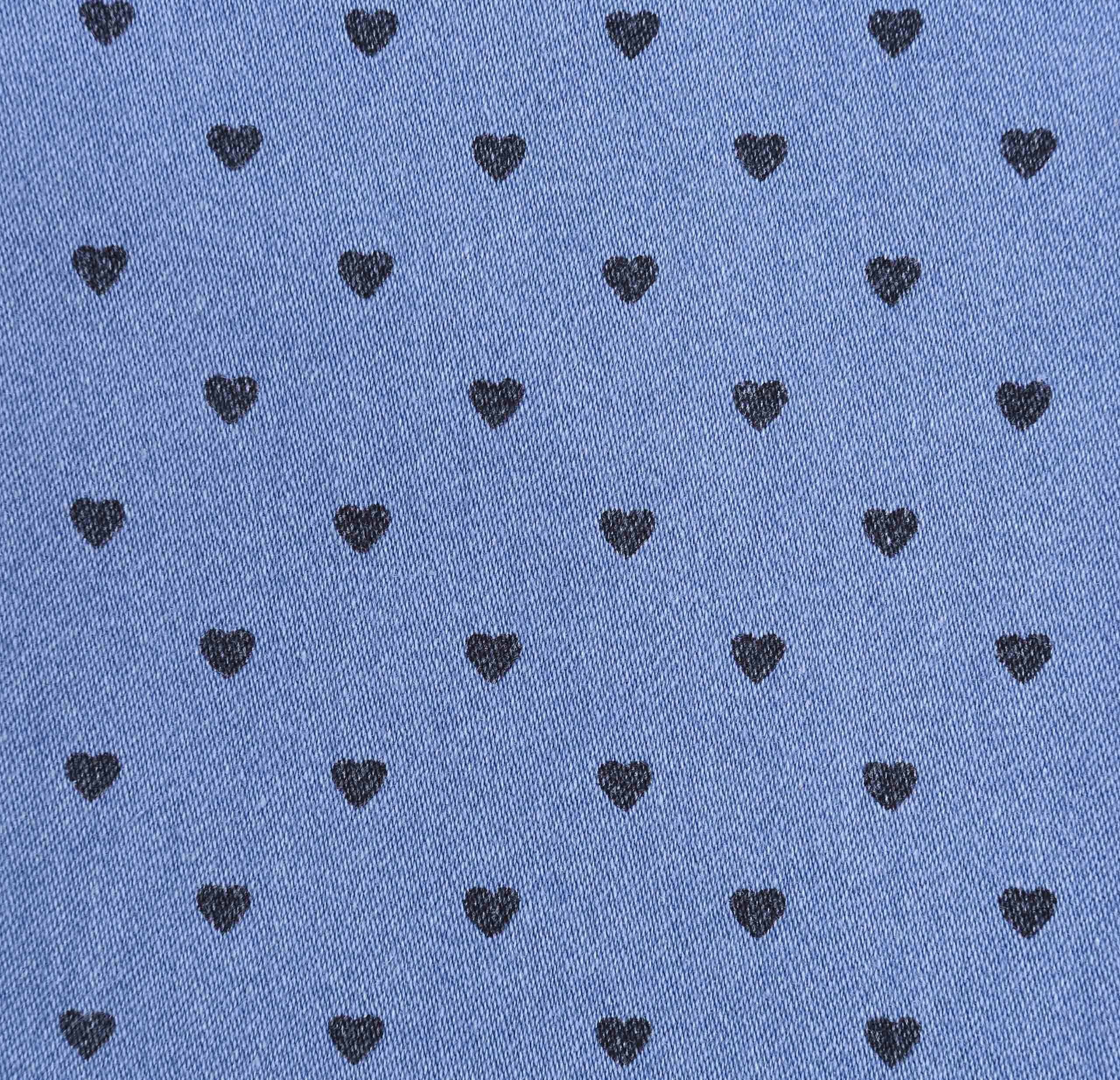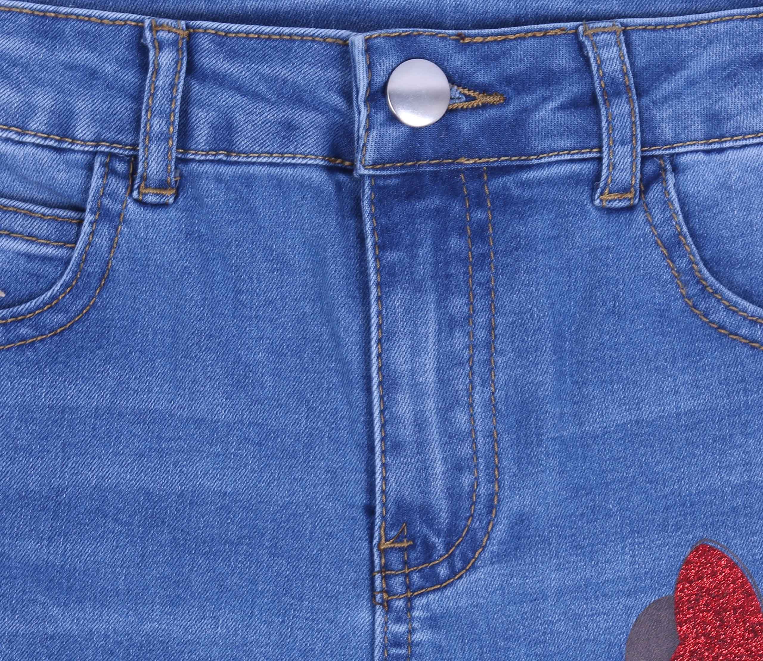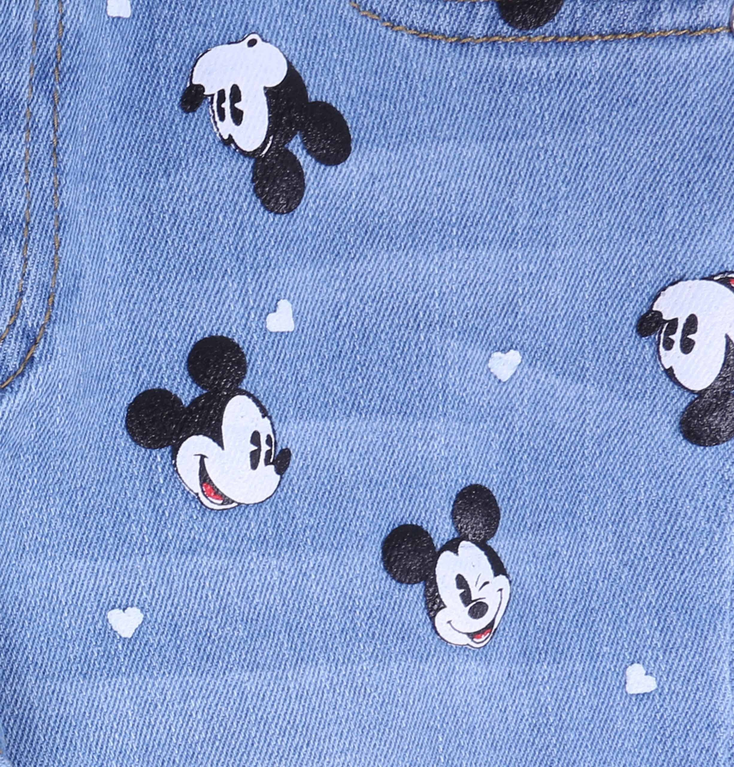 Jasnoniebieskie, jeansowe spodnie dziewczęce, ze zwężaną nogawką, w powtarzający się wizerunek Myszki Mickey.