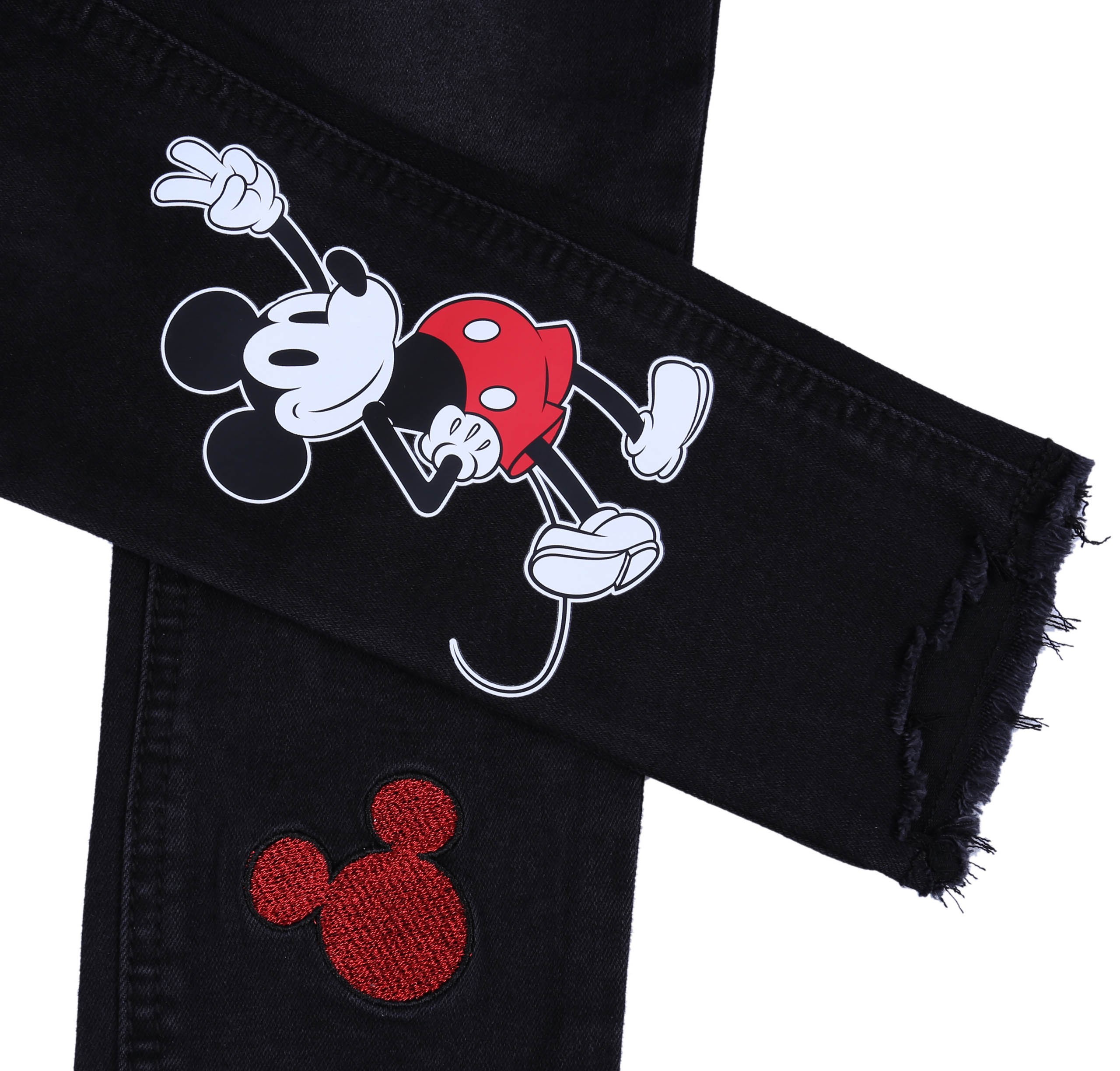 Spodnie z motywem Myszki Mickey w formie haftu, naszywki i nadruków.