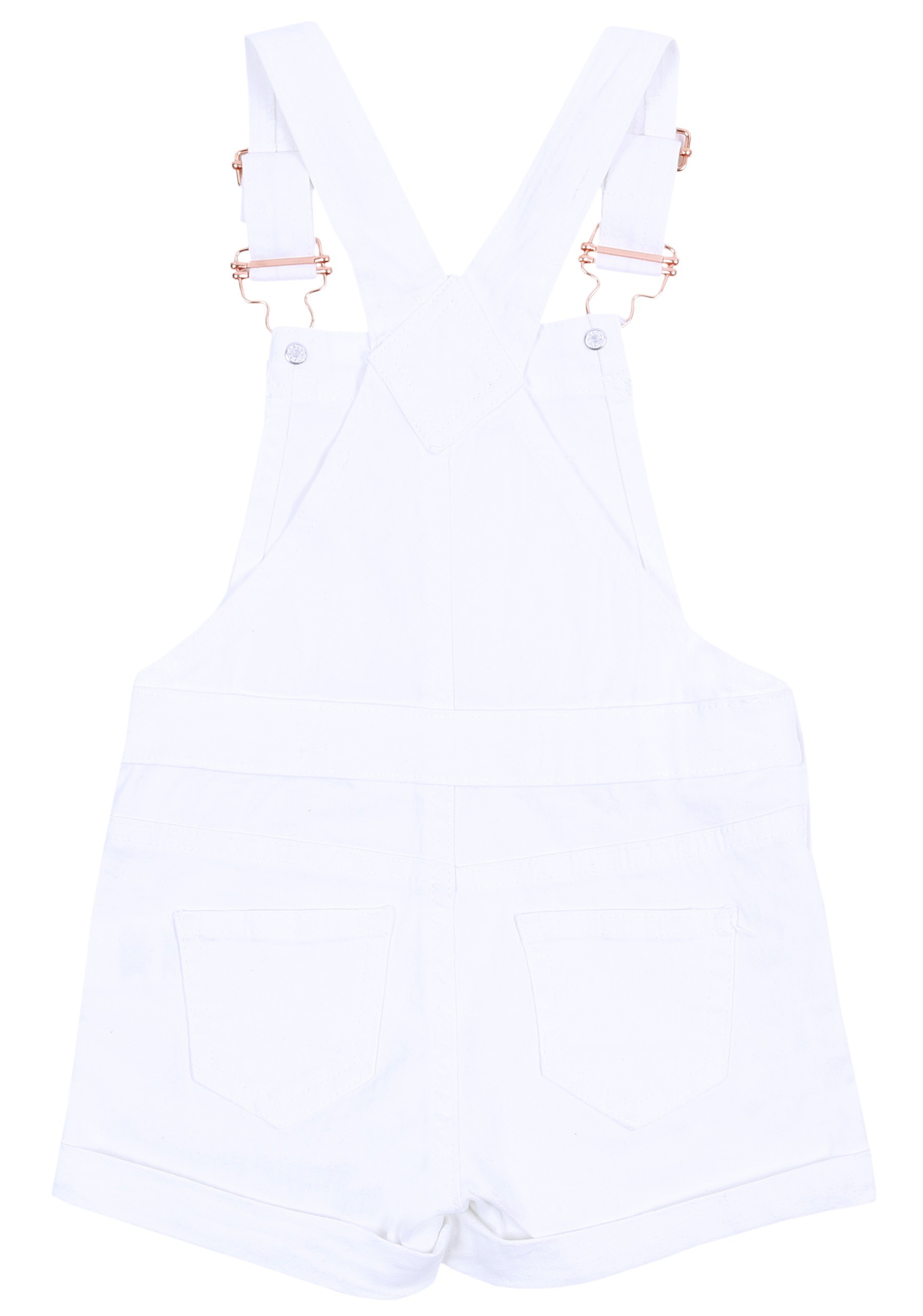 Białe, krótkie ogrodniczki z guzikami w kolorze różowego złota.