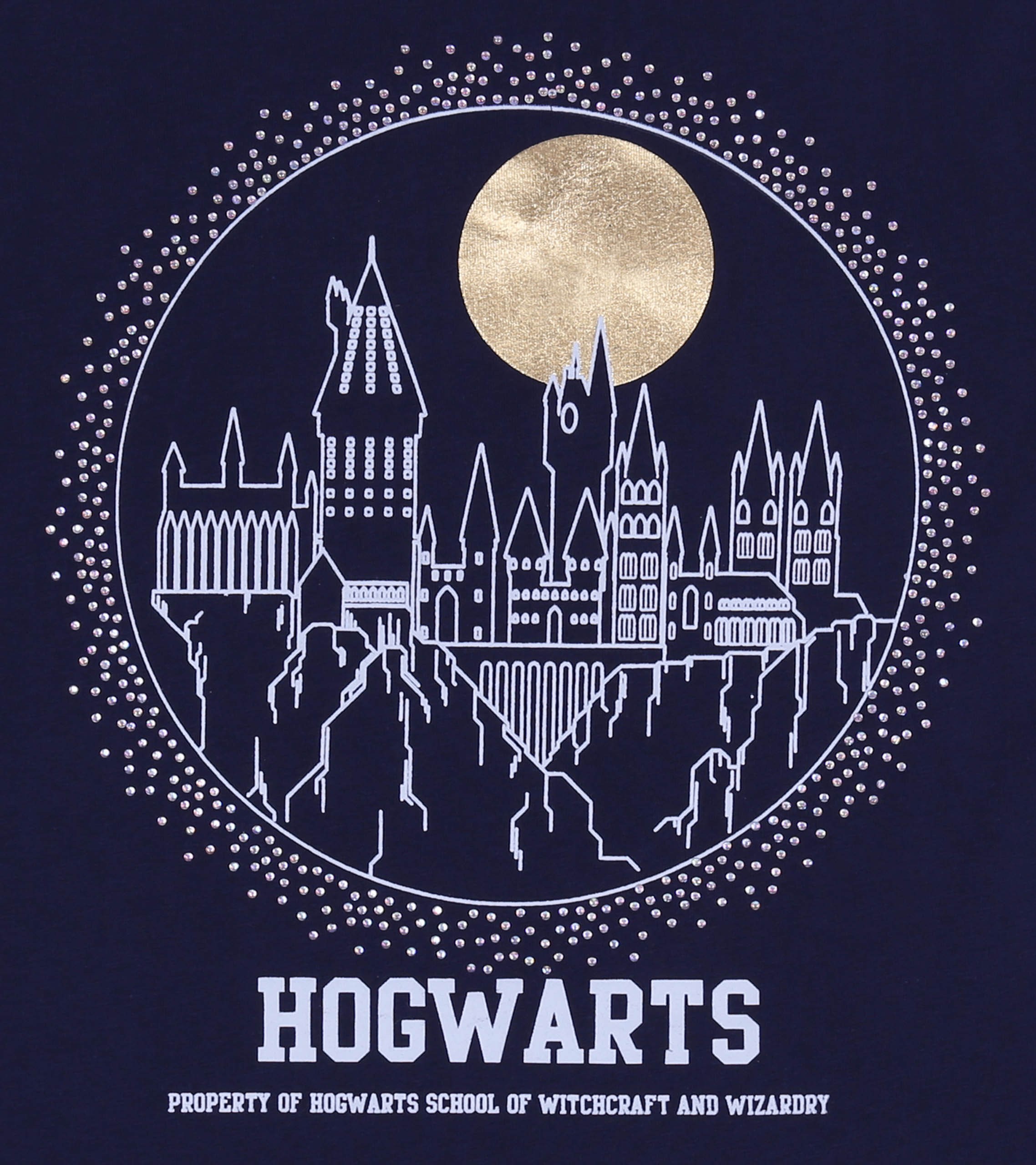 Granatowy, dziewczęcy T-Shirt/koszulka z białym nadrukiem - logo Hogwarts, motywem z filmu ''Harry Potter''.