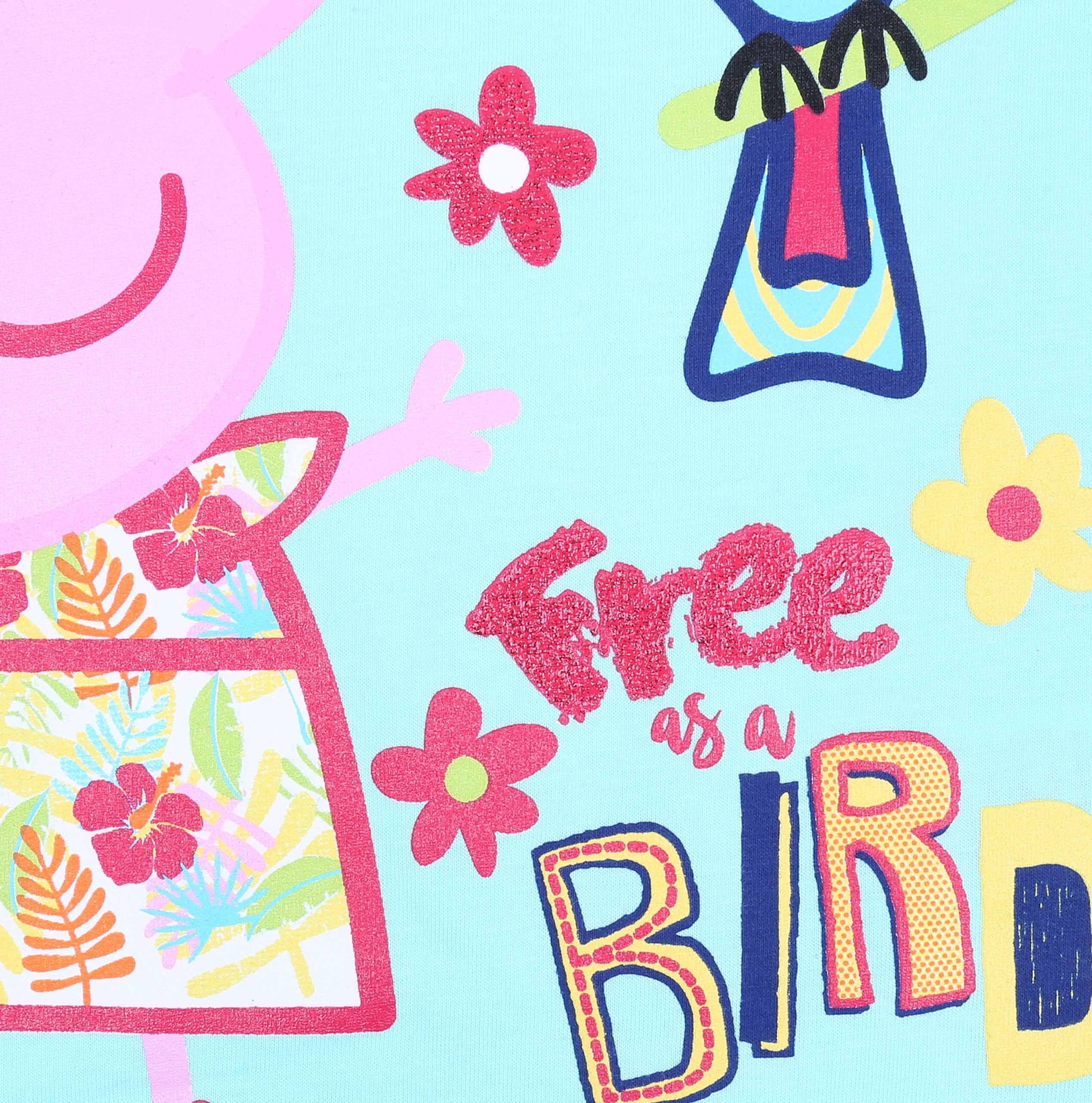 Z przodu znajduje się kolorowy nadruk z motywem Świnki Peppy i tukana oraz napis "Free as a bird".