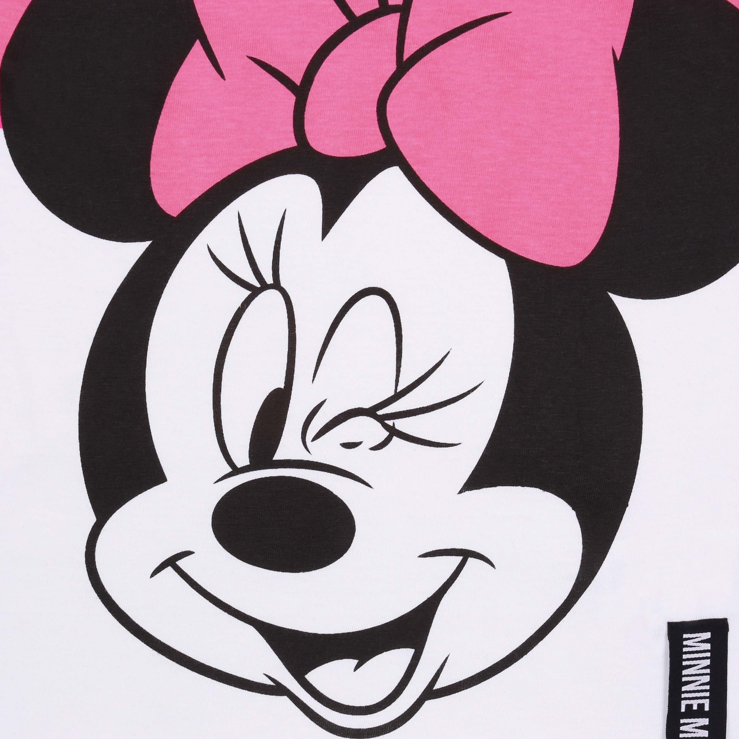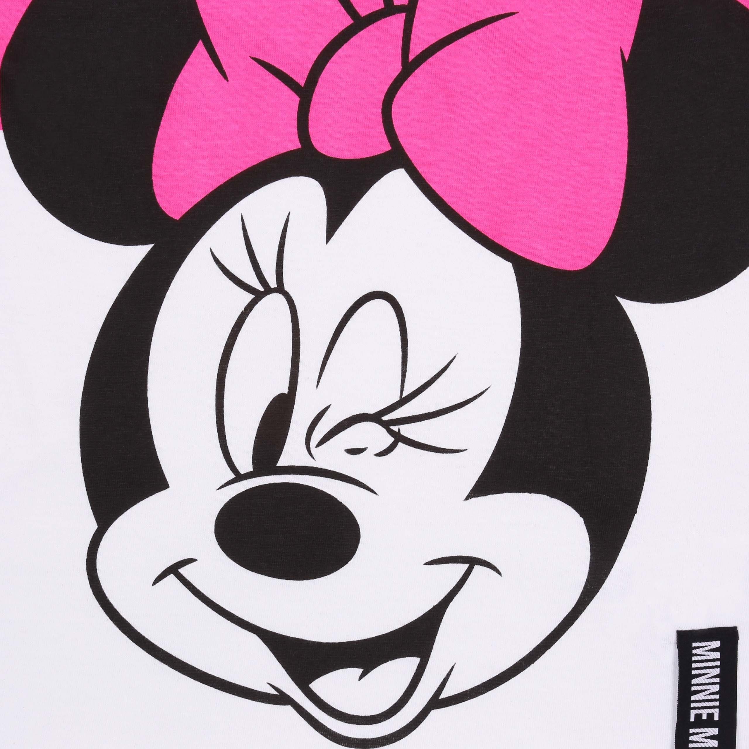 Biało-różowa koszulka na krótki rękaw z dużym nadrukiem wizerunku Myszki Minnie na przodzie.