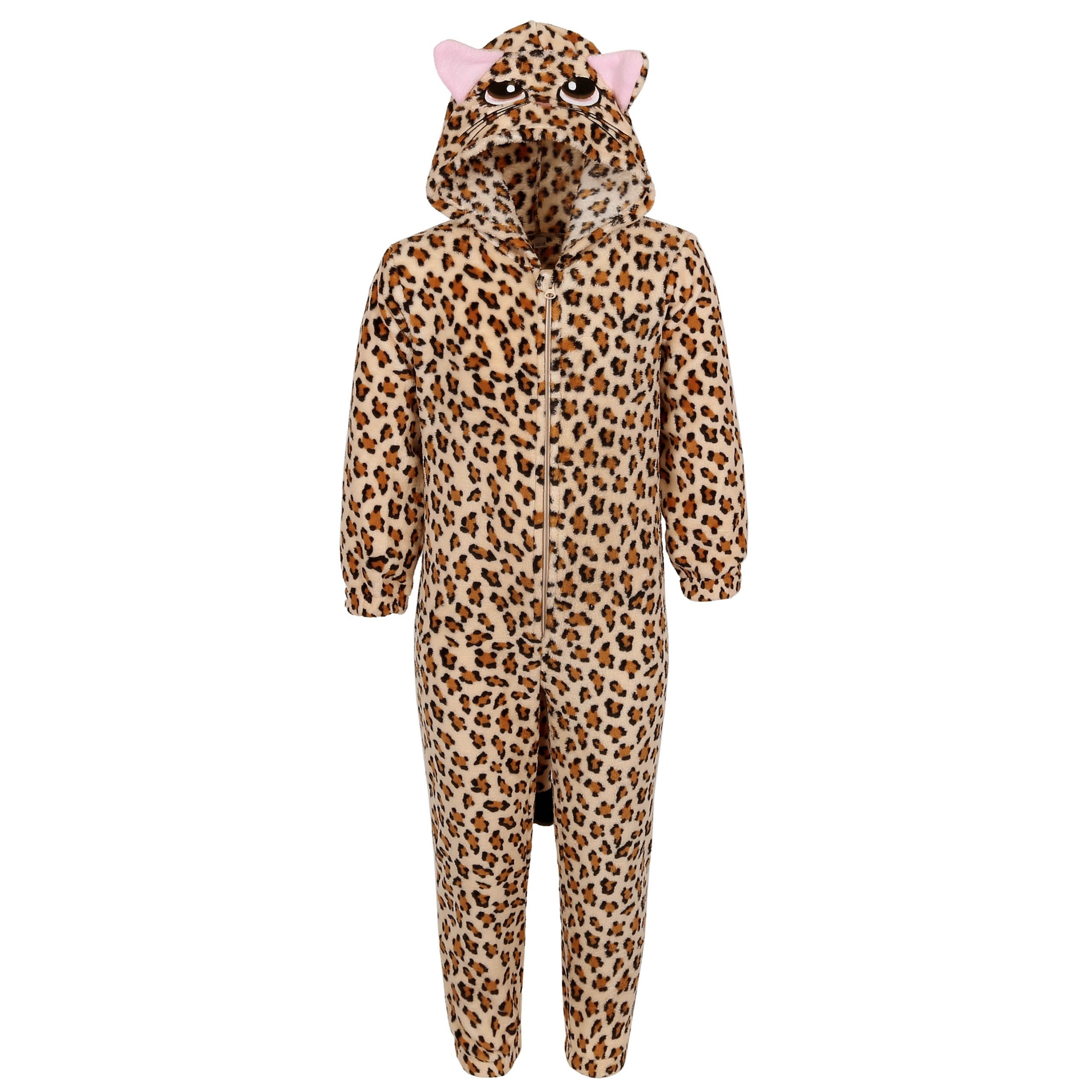 Beżowa piżama jednoczęściowa dziecięca z motywem pantery, z kapturem.