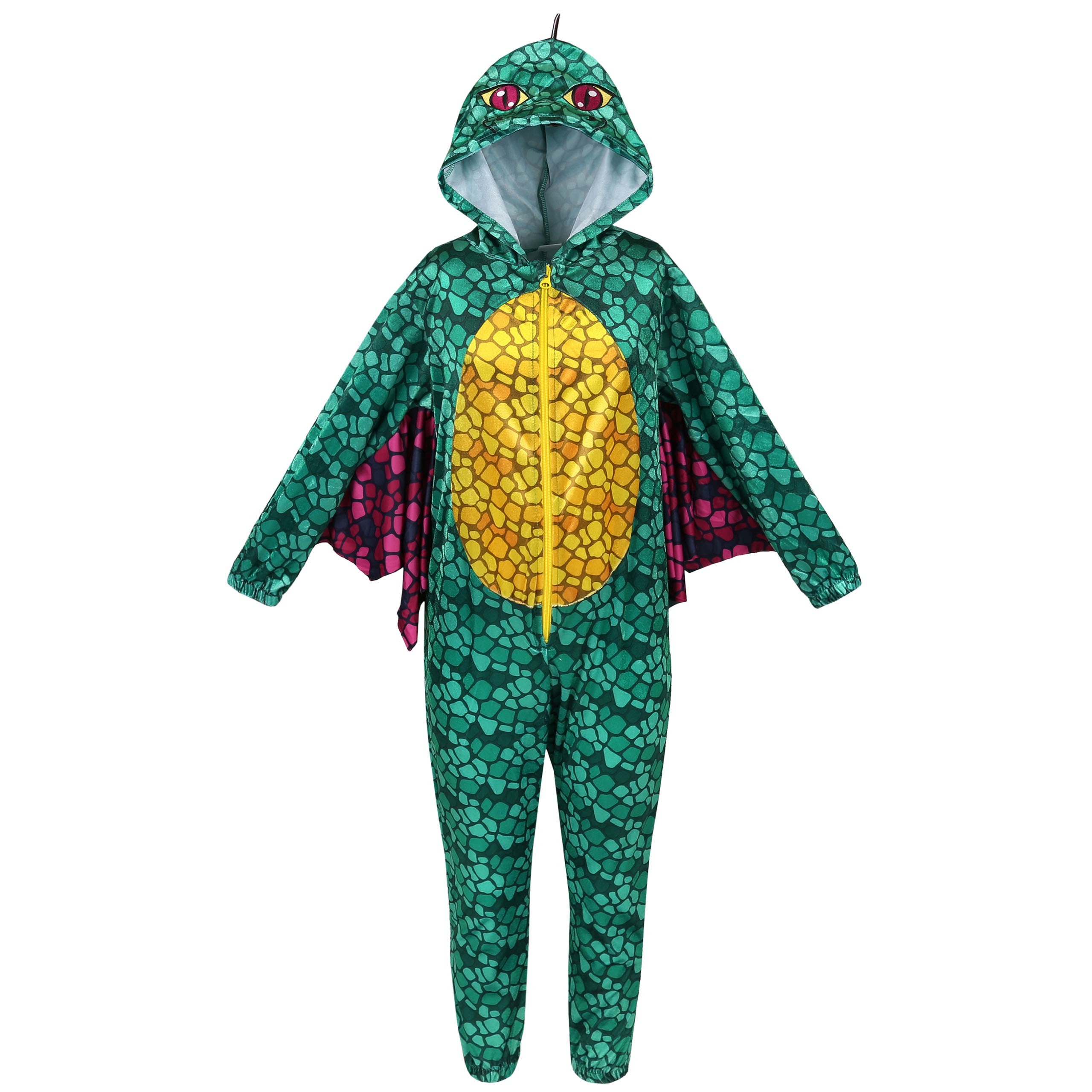 Zielona piżama jednoczęściowa dziecięca z motywem smoka, z kapturem.