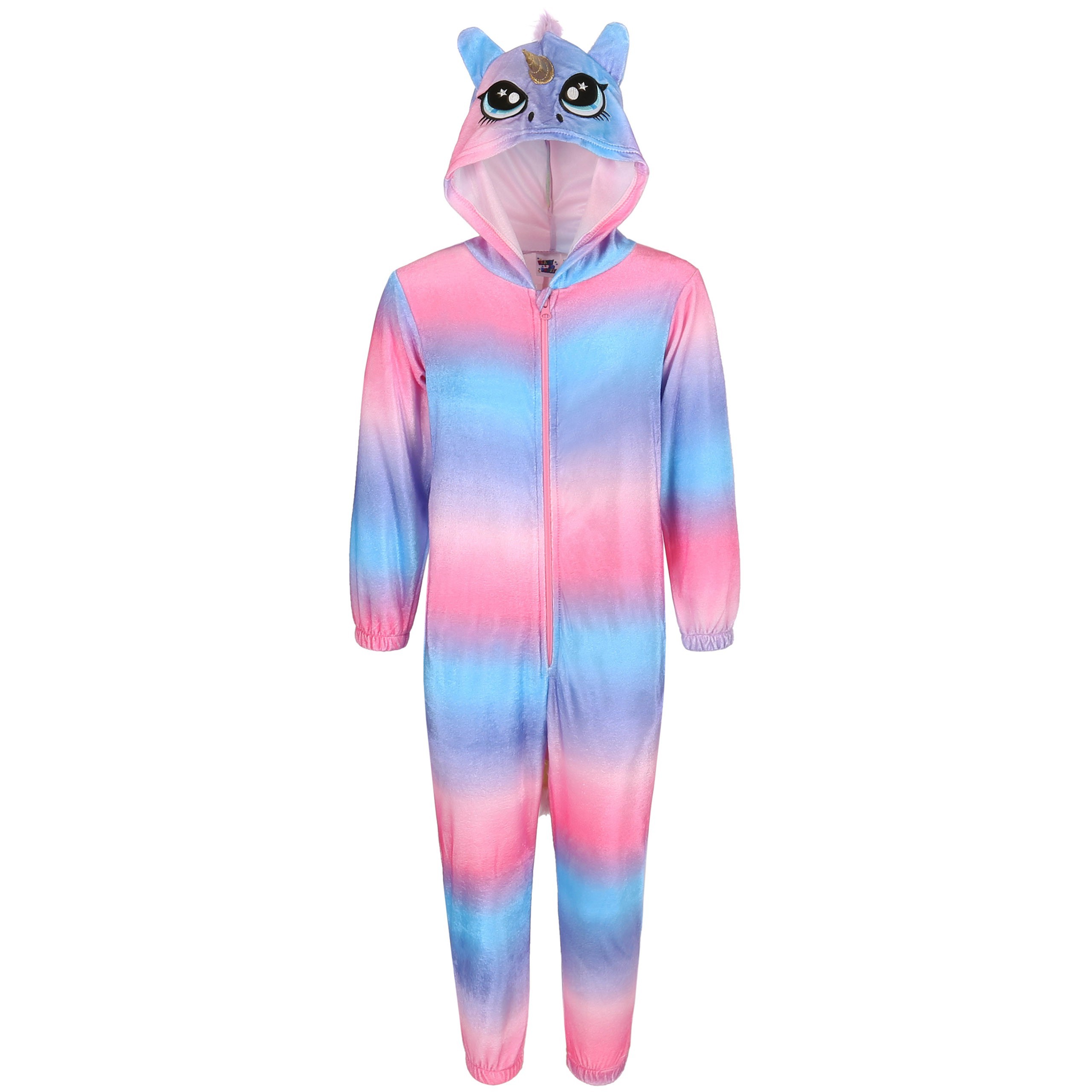 Pastelowa piżama jednoczęściowa dziecięca z kolorowym motywem jednorożca, z kapturem.