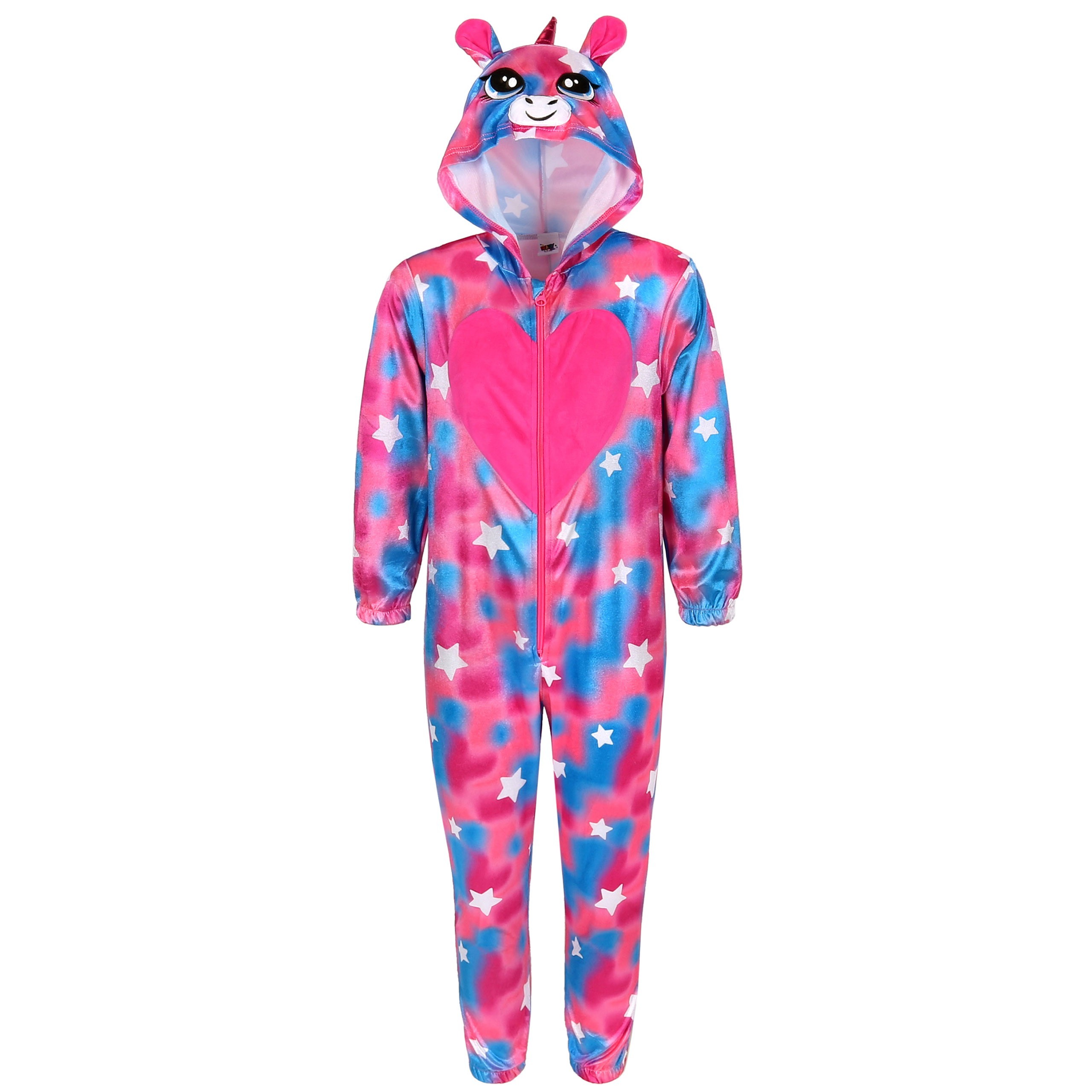 Kolorowa piżama jednoczęściowa dziecięca z motywem jednorożca, z kapturem.